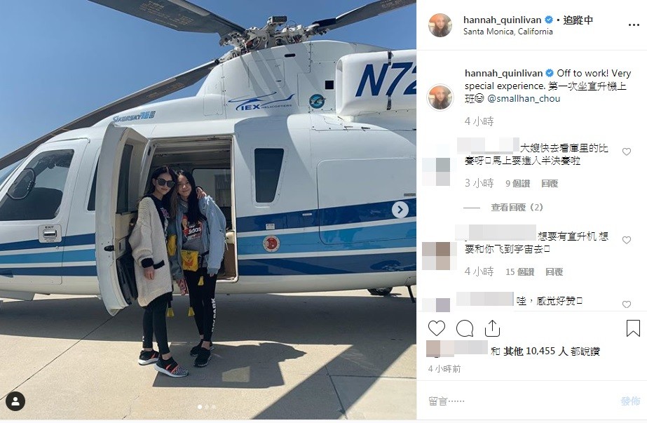 昆凌25日PO出準備搭直升機的照片,寫道:「Off to work!Very special experience. 第一次坐直升機上班。」並在直升機前做出各種擺拍,感受得出昆凌相當興奮,近年她朝國際路線發展,確實是需要到處飛來飛去,有網友便猜測這是周杰倫的安排。
