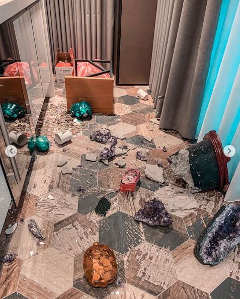 但最讓人驚嚇的還是主播李芳瑜,她在IG分享自家紫晶洞被震倒碎落一地,損失慘重!照片看起來真的好恐怖,也難怪會讓她崩潰大喊:「財位慘不忍睹」。