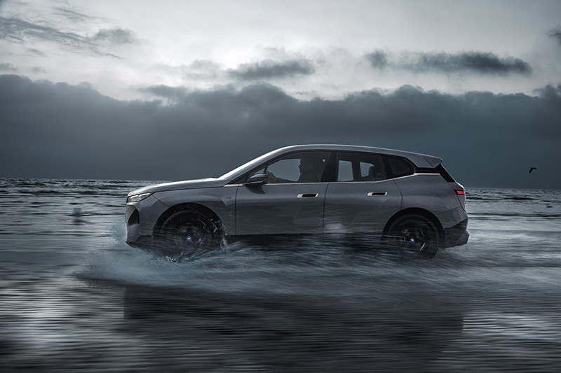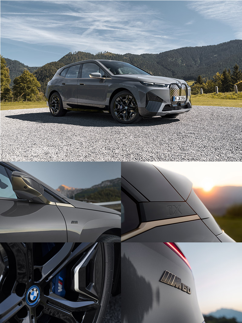 全新亮相的iX M60外觀配置專屬空力套件,專屬的鈦青銅車側飾板,以及在車側與車尾之高亮黑色、鈦青銅色相撘之專屬M徽飾,展現身分,並搭配藍色M款煞車卡鉗與可選配的22吋空氣力學設計鋁圈。車體採鋁合金空間衍架車體結構,並在車頂、車側與尾部輔以CFRP碳纖維強化塑料所構成之籠型結構,具高剛性與輕量化特性;CFRP碳纖維強化塑料首度運用於2003年推出的M3 CSL,至今BMW M GmbH大量運用該材質於旗下車款。優異的空氣力學設計,造就iX M60風阻係數僅cd 0.26;而置於底盤的高壓電池,有效降低車輛重心,讓iX M60可維持BMW一向引以為傲的均衡配重,以利提供優異操控性能。同時iX M60也搭載了M GmbH特別調校、並具有自動水平控制功能專屬氣壓懸吊。
