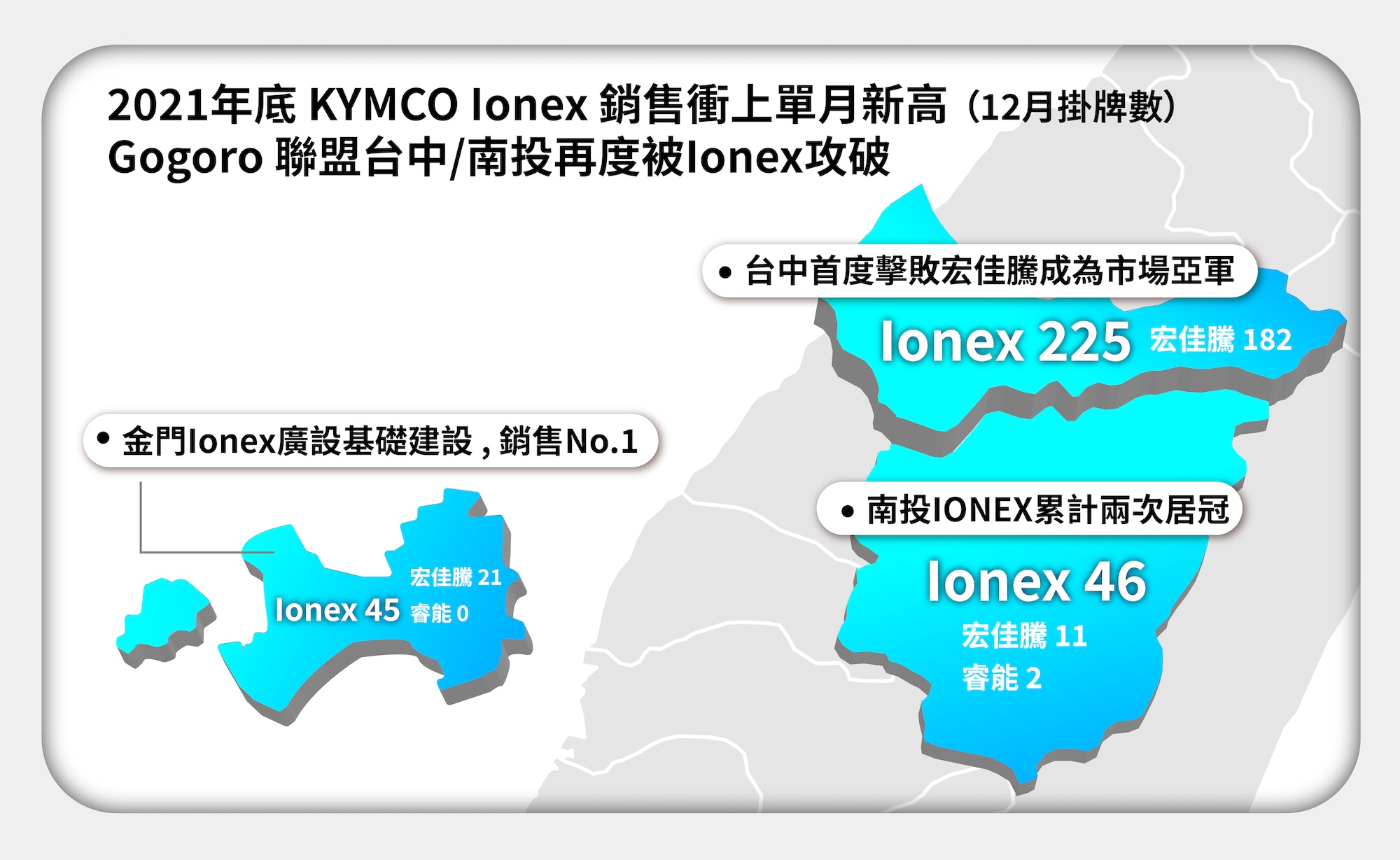 年末 12 月各大品牌陸續祭出優惠方案搶市,Ionex 以「超級享」方案回饋所有消費者,12 月單月銷量就逼近千輛大關,與宏佳騰僅差 3.2 個百分點,強勢威脅 PBGN 聯盟成員。根據交通部監理所掛牌數據,Ionex 在台中市已成功超車宏佳騰,在南投縣更以超過四倍的銷量直衝第一,Ionex 在中台灣已攻破 PBGN 聯盟防線,往市場第一之路邁進。