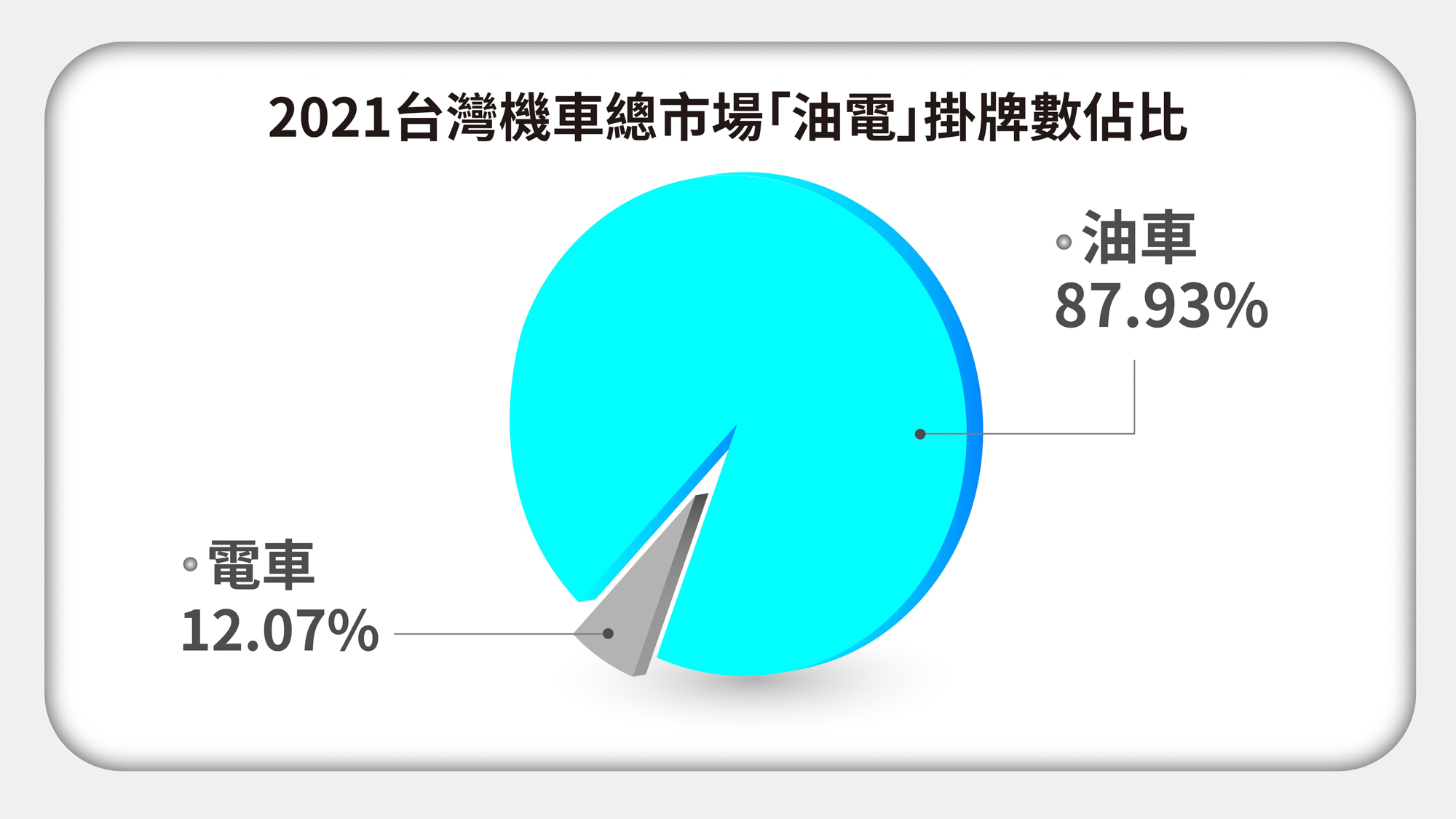 燃油機車與電動機車的市場佔比表現,2021 年累積數據為 87.93%:12.07%,在政府大力推動淨零減排政策下,電動機車市場佔比重回雙位數。其中最值得關注的光陽 Ionex 為電動機車市場注入活水,自三月重磅發表Ionex 3.0 後,Ionex 在疫情趨緩後陸續上市多款新車, 2021 年末四個月呈現暴風式成長,以 9 月單月 216 台銷量對比 12 月單月 945 台,成長率達 337.5%,截至 2021 年底更累積高達 2,914 輛優異成績,以電車第三之姿超越 PBGN 聯盟旗下四個電動機車品牌(中華 eMOVING、摩特動力 PGO、山葉 Yamaha 以及台鈴 SUZUKI),成為 2021 年電動車成長之冠。