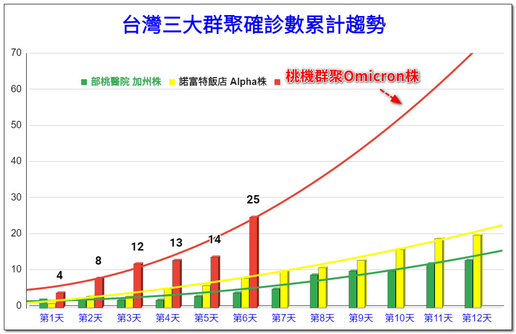 【健康醫療網/記者楊艾庭報導】Omicron變異株已經入侵台灣社區,在國外的疫情是爆炸性的增長,現階段無論政府、醫療單位、全民都必須同心協力對抗疫情散播,BillyPan 潘建志醫師更於網路個人專頁分析,台灣過去一年三大群聚案,其確診累計的速度,包括去年1月的部立桃園醫院的加州株,去年5月諾富特飯店的Alpha株,和這次桃機群聚的Omicron株,Omicron速度與走勢相較另外兩案差異相當明顯。