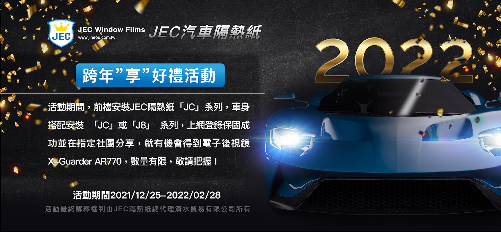 「指定安裝抽好禮」活動即日起至2022年 2 月 28 日止,週週抽、週週送!活動期間內於JEC隔熱紙正式授權經銷商,為愛車安裝指定(前擋JC系列+車身JC系列,或前擋JC系列+車身J8系列)隔熱紙,安裝現場填寫「回執聯」後「上網登錄保固」,並在任一「FB汽車社團」分享體驗文(至少附3張照片),並hashtag 「JEC汽車隔熱紙,即達成遴選資格,參加X-Guarder AR770電子後視鏡抽獎活動。