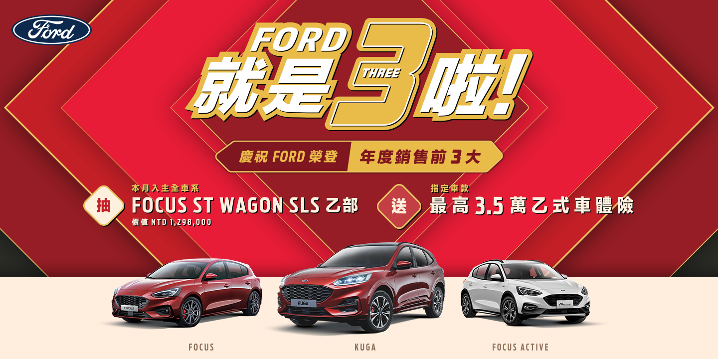 Ford 全車系 | 活動期間:2022年1月1日起至2022年3月31日止 於各Ford經銷據點完成Ford任一新車款領牌,即具備乙台Focus ST Wagon – SLS Edition之抽獎資格 |
