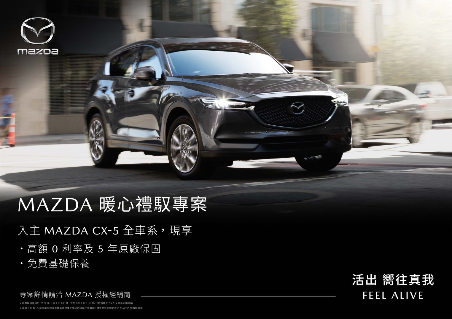 即刻入主MAZDA CX-5搭配本月「暖心禮馭」專案,立享「高額0利率」,再享「5年原廠保固」,同時加贈「免費基礎保養」;此外,本月購買MAZDA6全車系可享「5年原廠保固」。