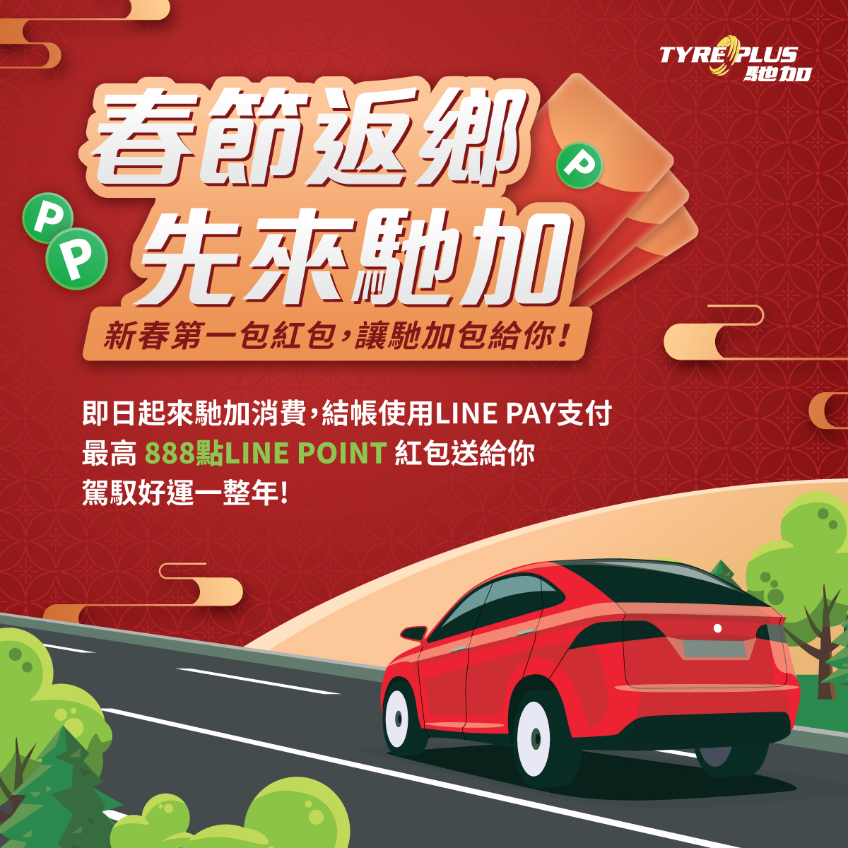 由法國米其林集團為亞太地區以及全球各大重要新興市場所量身打造的 TYREPLUS 馳加汽車服務中心,今推出「來馳加抽LINE PAY紅包活動」。活動時間為2021/12/28~2022/1/28 (或LINE POINT點數送完為止),錯過恐怕就要再等一年。車主於活動期間只要至馳加門市指定消費金額達NTD 1,000元並使用LINE PAY付款,即可抽LINE POINT 紅包一個,紅包不僅人人有獎,還有機會抽中最高LINE POINT 888點的頭獎。
