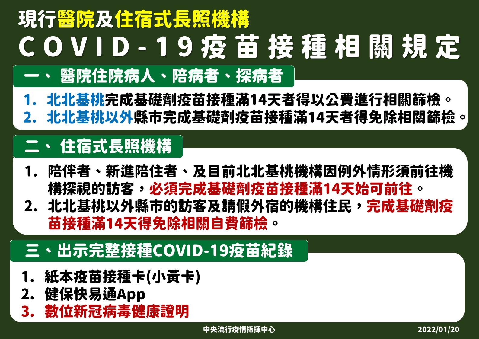 指揮中心表示,國內本土疫情尚未平息,存在社區傳播風險,自1月21日起,民眾前往「歌廳、舞廳、夜總會、俱樂部、酒家、酒吧、酒店(廊)、理容院(觀光理髮、視聽理容)及特種咖啡茶室、夜店、舞場、三溫暖」等休閒娛樂場所時,應配合出示完整接種COVID-19疫苗紀錄2劑且滿14天紀錄,才能入內活動消費。接種紀錄除出示「紙本疫苗接種卡」外,亦可使用「健保快易通」或「數位新冠病毒健康證明」提供檢視。請民眾務必配合,也請業者落實查核,使顧客安心消費,同時保護員工健康安全。