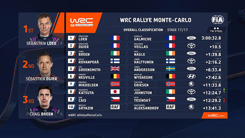 在四天17個分段比賽中,兩位Sébastien可說是互有領先,甚至在第10個賽段中一度戰成平手,其餘兩者間差距幾乎都不會超過10秒,到了最後一天的比賽,到第15個賽段結束,Sébastien Ogier拉開領先到24.6秒,但最終勝利之神卻轉向Sébastien Loeb,Sébastien Ogier最後因左前輪爆胎失去領先,最後由已經47歲的Sébastien Loeb以10.5秒之差奪冠,這也是他生涯第8次在蒙地卡羅拿下該站冠軍,追平了Sébastien Ogier的紀錄,這兩人自2003年開始,至今將近20年,在蒙地卡羅各拿了8次冠軍,兩者並列蒙地卡羅之王。