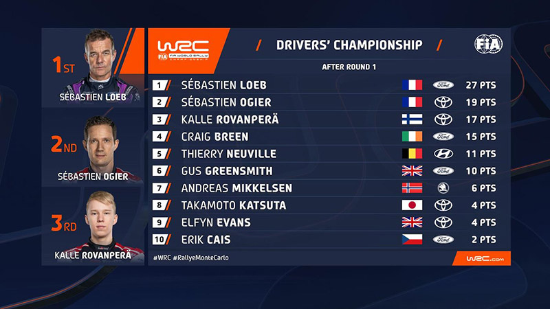 M-Sport Ford World Rally Team除了Sébastien Loeb寶刀未老開紅盤,另一位主戰車手Craig Breen也以第三名完賽,這讓M-Sport Ford World Rally Team在首站結束後於車隊積分上領先尋求衛冕的Toyota Gazoo Racing WRT,但也僅領先三分,下一站賽事將移師瑞典舉行本賽季唯一的一場冬季賽事,時間為2月24日至27日。