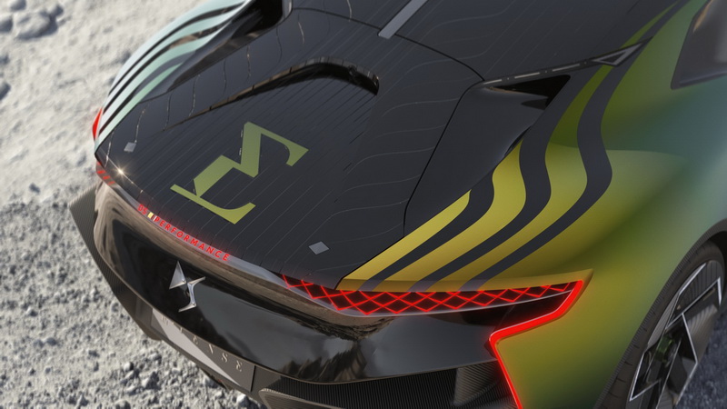 DS E-Tense Performance概念車是以賽車為靈感所打造,輪廓上仍延續2016年於日內瓦車展發表的E-Tense概念車為主軸,不過細節處如前車燈以更有稜有角LED燈條雕塑出更犀利的眼神,車燈之間也採以發光式面板凸顯出品牌徽飾,上方飾蓋的散熱口也從原本的左右側移至上方,並將其色調換為黑色式樣以增添更多的個性化扮樣;車側主要改變是換上21吋低風阻輪圈,車尾造型與先前差異不大,主要是將車頂及尾廂蓋換成黑色調來強調更濃郁的性能感受。