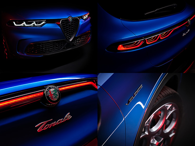 Tonale外觀上大致上就像是縮小版的Stelvio,與先前推出的概念版幾乎沒有太大的更動,充滿Alfa Romeo一貫的家族風格,車身尺碼長4.53m,寬1.84 m和高為1.6 m,車頭依舊以Alfa Romeo的盾型水箱護罩為起點,向兩側延伸至各三格狀LED頭燈的上緣與引擎蓋前沿所構成的GT LINE,有如1960年代的Giulia GT Junior,左右三格狀LED頭燈則會讓人聯想SZ Zagato,流線地C柱與後窗曲線則是向8C Competizione致敬。輪圈仍舊配上了Alfa Romeo最具代表性的五環樣式。