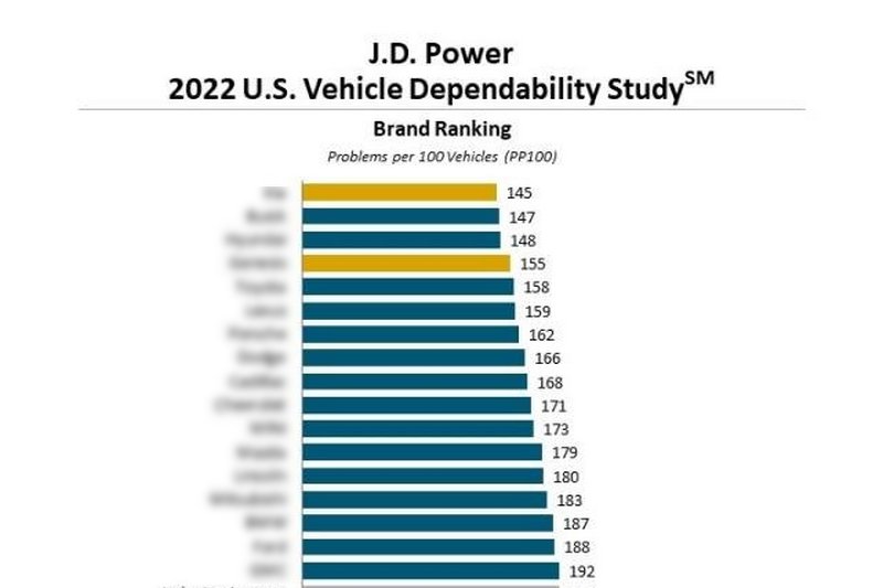 而2022年可靠度調查結果,Kia以每百輛車145個故障(145 PP100)為平價品牌成為冠軍,而豪華品牌則是由同集團的Genesis以155 PP100奪下第一,而這也讓韓國品牌以雙料冠軍成為最大贏家。在調查項目中以影音娛樂資訊系統抱怨最多,其中又以語音辨識問題最多,再來為Apple CarPlay/Android Auto連接、藍牙、導航介面等。