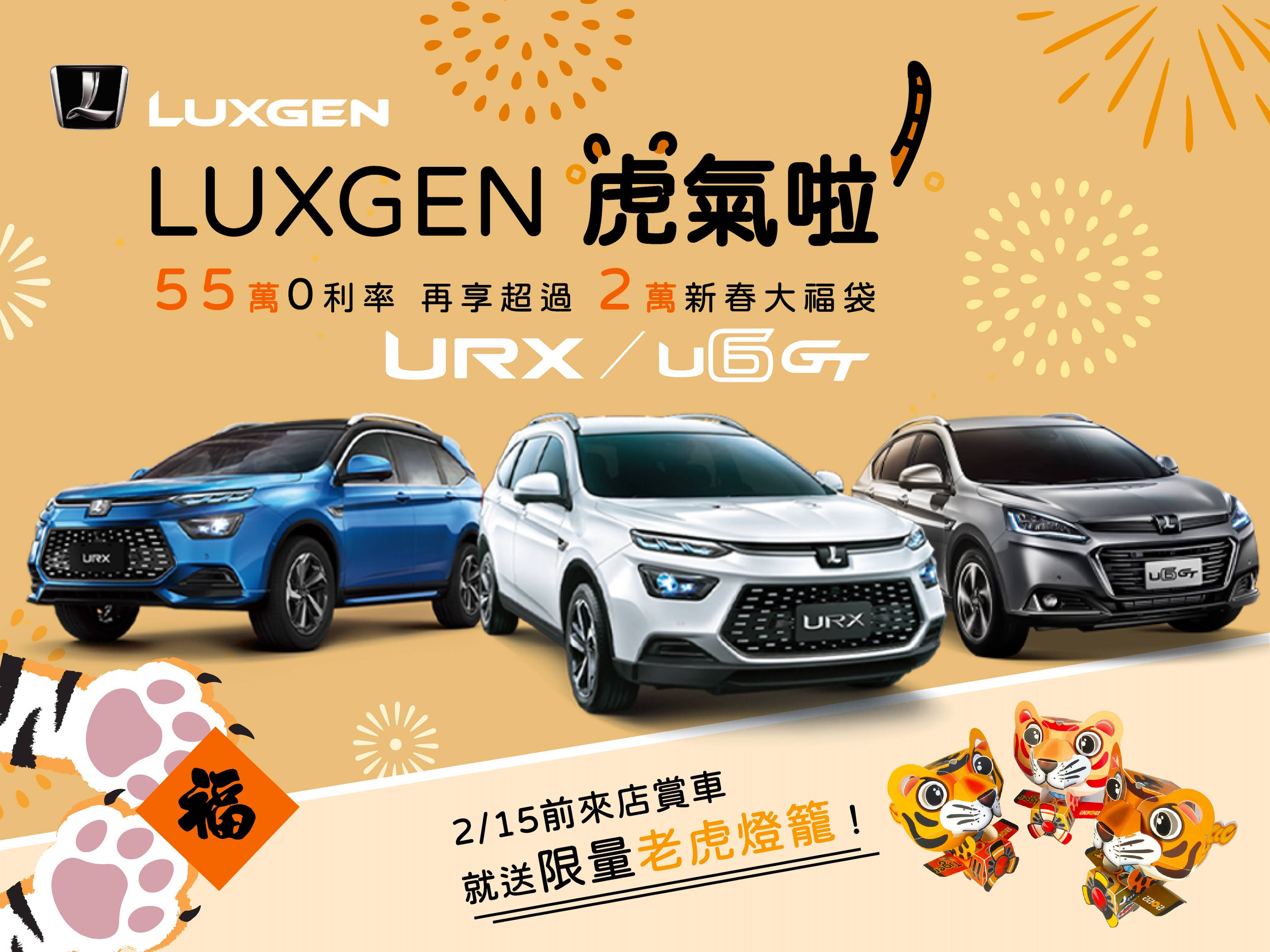 Luxgen 特別祭出「Luxgen虎氣啦」新春優惠專案(1),凡於2/1(二)至2/25(五)止,入主Luxgen URX樂活版、URX紳活版、U6 GT全車系,即享 55 萬分期零利率優惠(2),並加碼再送價值二萬元以上新春大福袋(3):包含原廠導航(價值10,000元),指定型號隔熱紙(價值11,000元),同步免費升級 PM2.5健康對策濾網(4)、終身免費返廠實施臭氧殺菌服務等好禮回饋。