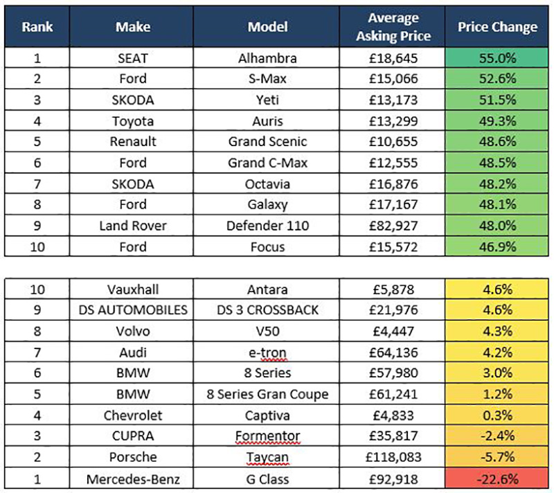 在過去一周,Seat Alhambra與Ford S-Max兩款MPV,與Skoda Yati漲幅最驚人,當漲了超過五成,分別為55%、52.6%與51.5%,而跌價跌最兇的則是Mercedes-Benz G-Class。