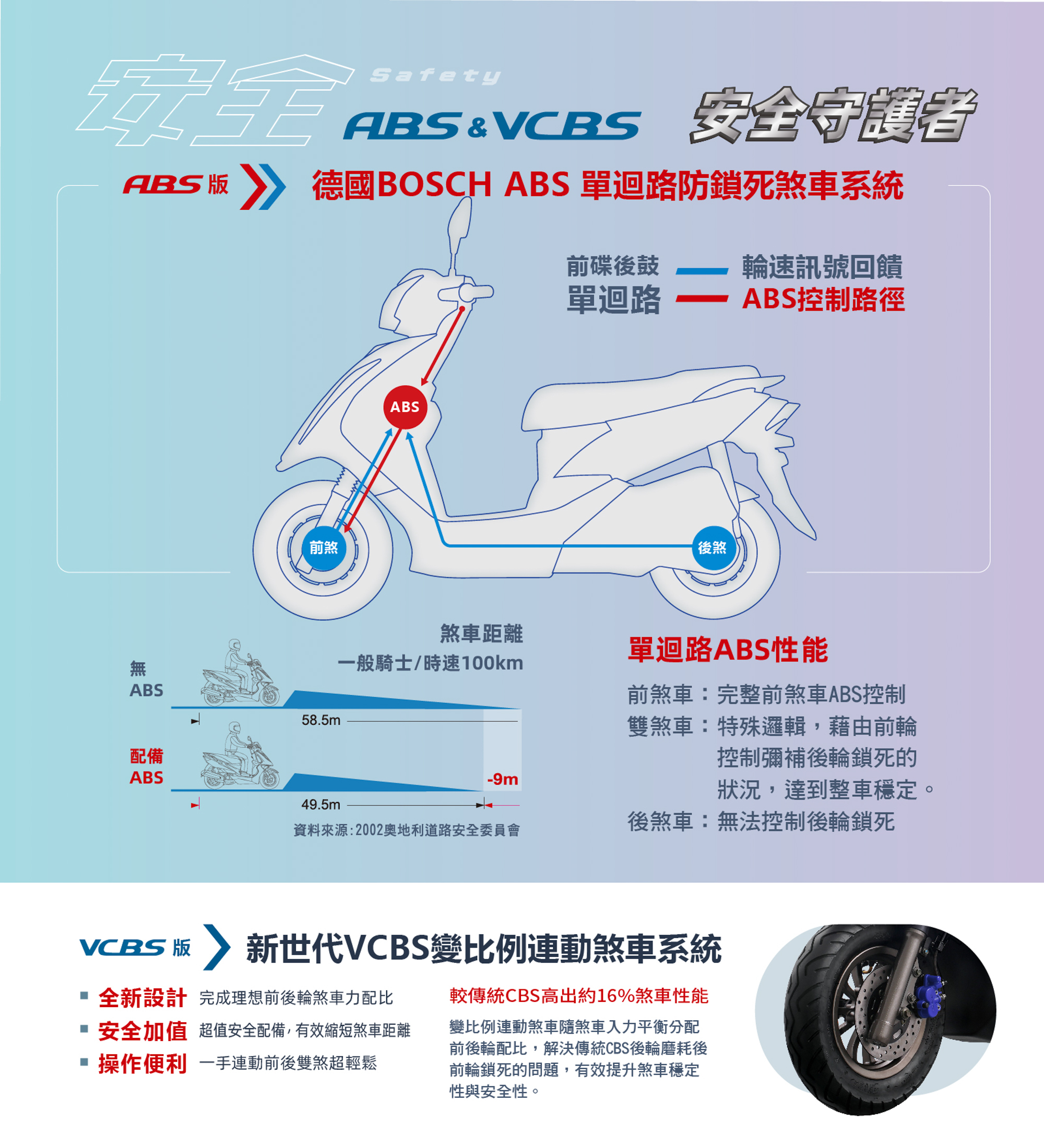 在制動系統上,PGO 提供了 ABS 與 VCBS 兩種車型選擇,其 VCBS 變比例連動煞車系統 (Variable Combined System),較傳統 CBS 高出約 16% 的煞車性能,變比例連動煞車完成理想前後輪煞車力配比,一手輕鬆連動前後雙煞車,此一優化可更有效地縮短煞車距離,提升煞車穩定性與安全性,加上五段可調後雙避震,讓後座乘客既平穩又安心。同時,推出搭載德國大廠 ABS 單迴路防鎖死煞車系統可供選擇。