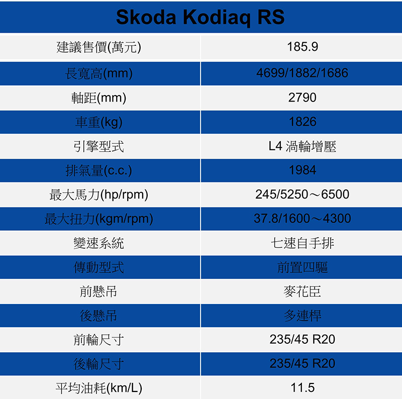 Kodiaq RS之所以讓人興奮就是擁有245hp/37.8kgm動力與6.6秒0~100km/h加速表現。