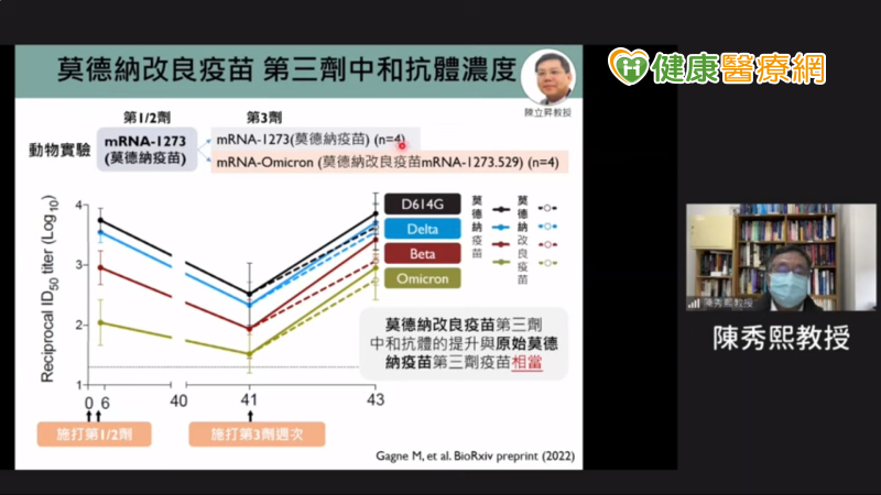近期莫德納針對變種病毒研發次世代疫苗,究竟效果如何?台北醫學大學陳立昇教授表示,根據動物實驗結果顯示,接受過兩劑莫德納疫苗之後,中和抗體的濃度隨時間下降,接著,分別在接種改良過的莫德納次世代疫苗,以及未改良過的原始疫苗。兩週後,第三劑原始疫苗對於Delta、Omicron的中和抗體濃度皆有不錯的表現,而改良過的疫苗,也發現與原始疫苗效果相當,但稍稍遜色一些。不過,陳立昇認為,這是動物實驗的結果,若未來改良疫苗用於人體,或許會有不同的表現,期待疫苗持續研發。