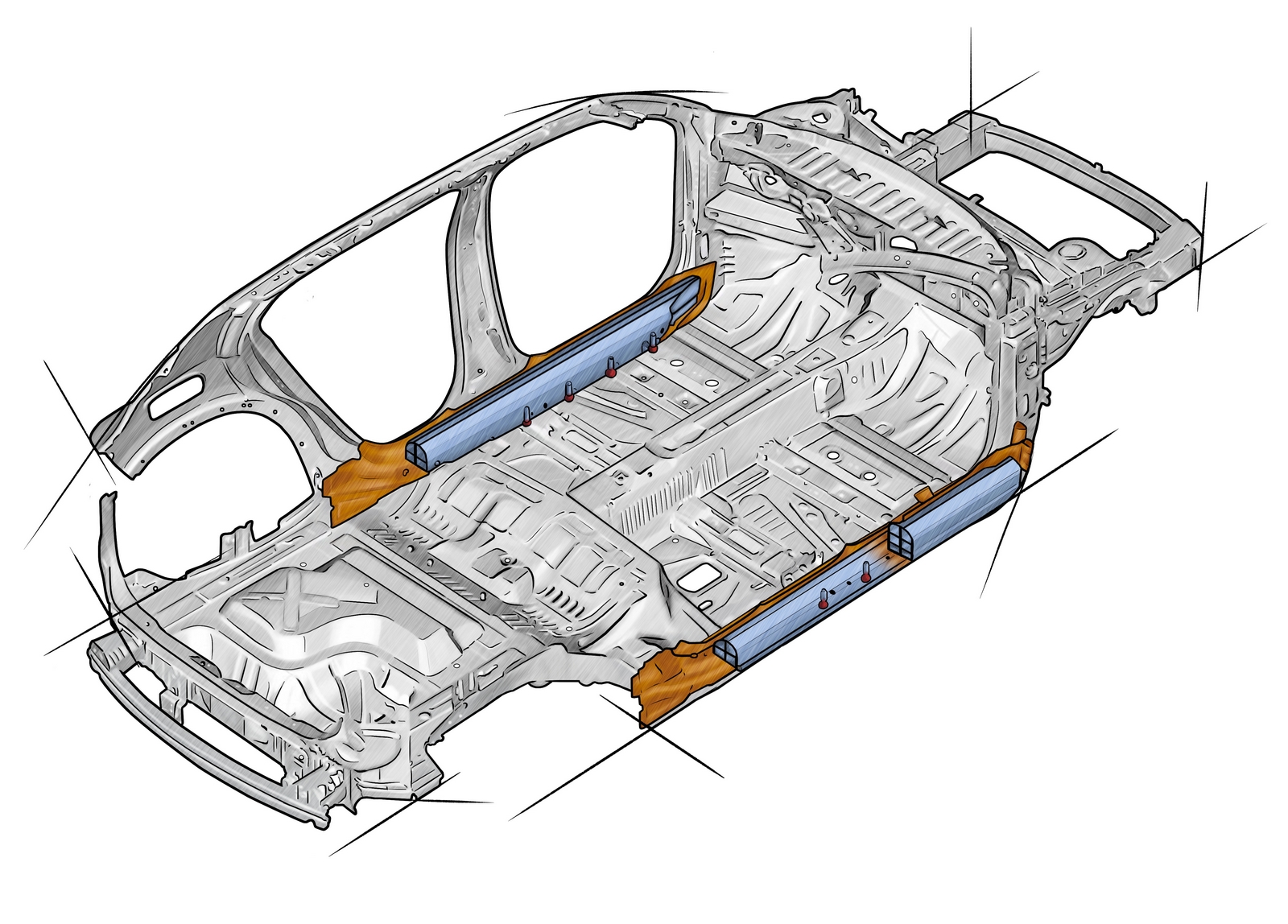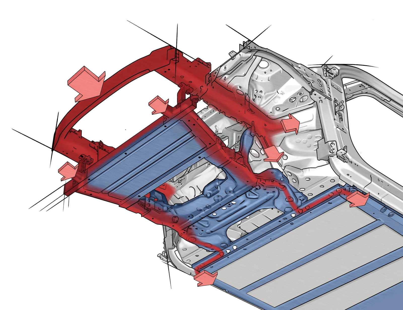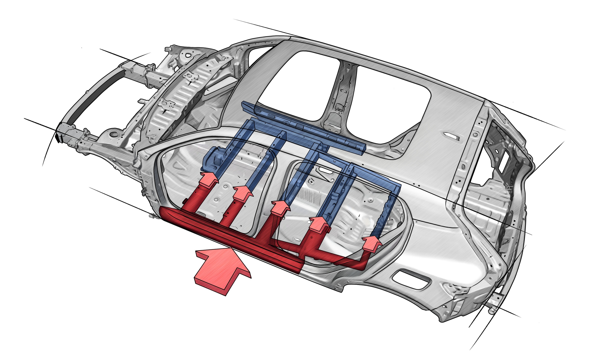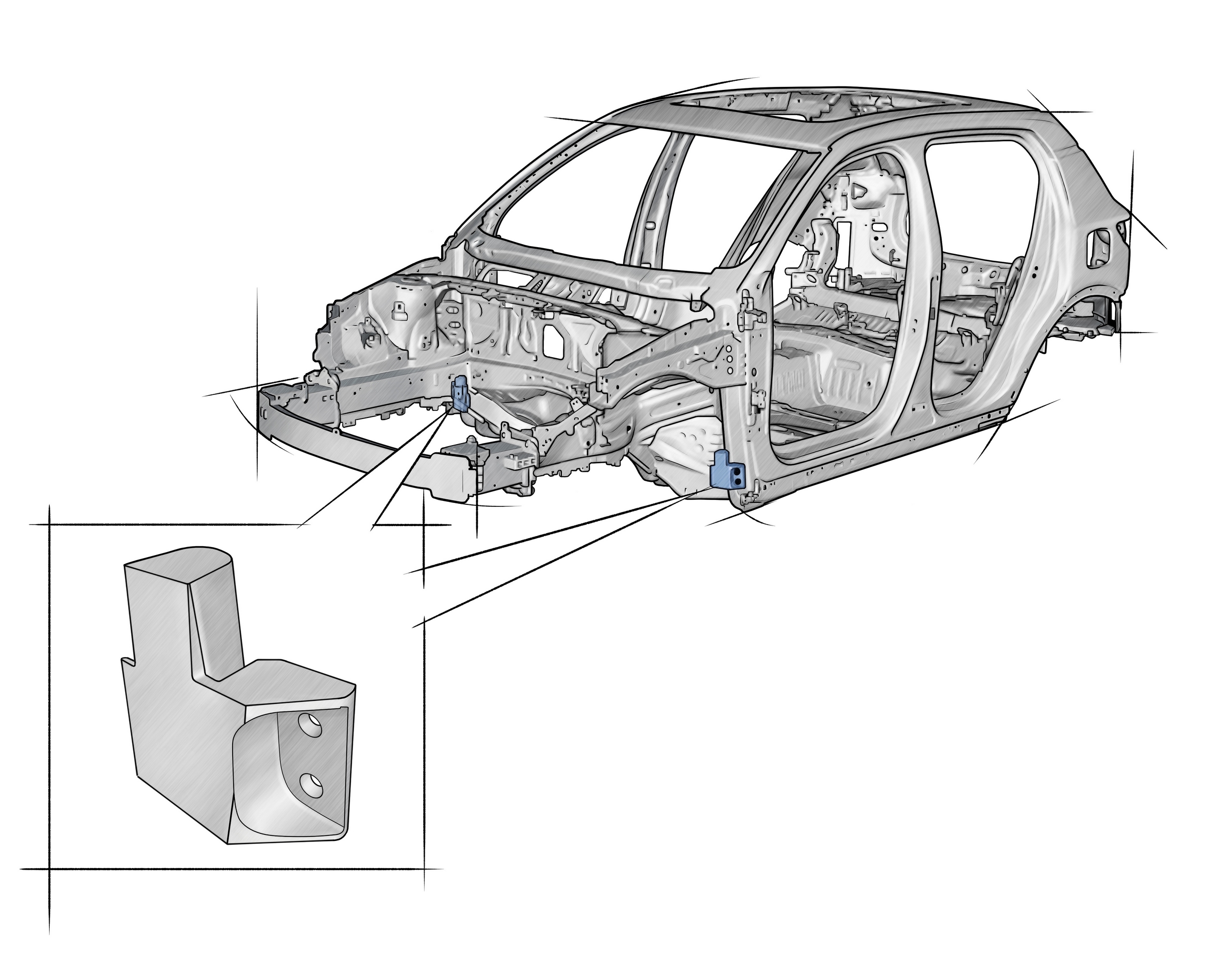 針對車體安全結構,專為電動車配置的 CMA 平台優化前方結構增加遇碰撞時的安全性,前方潰縮區亦強化下方防撞鋼樑確保車室完整性;兩側 A 柱下方靠近底板處設有鑄鋁滑塊,在小偏位撞擊情況下能帶動車輛向外偏滑藉以減少傷害;發生側面撞擊時,鋁擠型的堅實底樑與電池外框可確保側面結構穩定,同時傳導碰撞力量分散至車廂外,保護車室及高壓電瓶模組,顯示 CMA 平台的多元性,有別於其他油車平台改上電池馬達組之電動車,是以電動車設計思維打造。