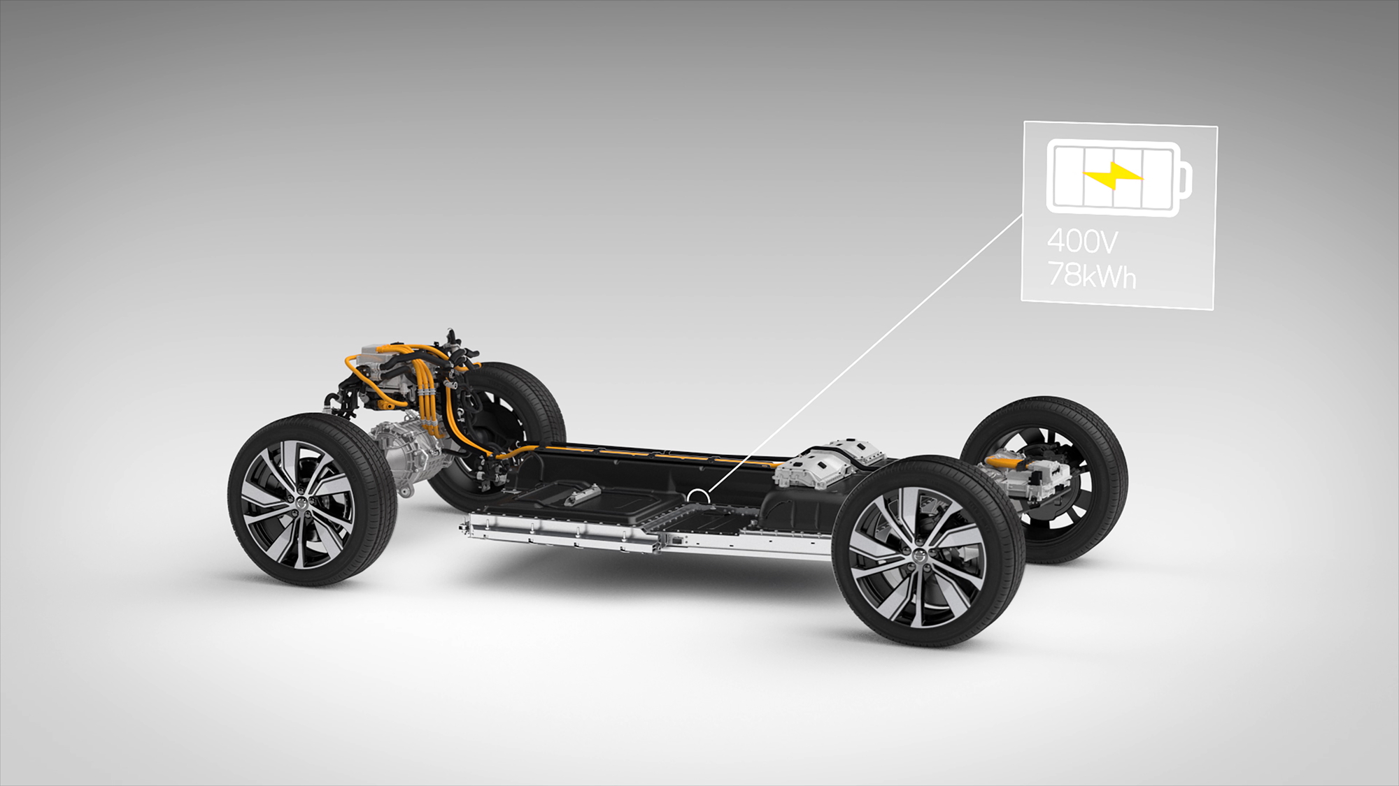 Volvo XC40 Recharge P8 AWD 以 400V 高壓鋰電池系統提供 78 kWh 容量,多達 27 個模組組成,以扁平堆疊的方式置於車身底板下方,創造低重心且沉穩的駕馭優勢;前後各一 E400V6 永磁同步馬達帶來全時四輪傳動的優勢,讓前後車身配重比為理想的 52:48。在 27 個串聯電池模組中,每個電池模組設有 2 個溫度感知器精密監控電池溫度與電壓,透過充放電範圍 SoC (State of Charge) 調整可用電池容量,監控獨立電池蓄電量,若遇氣候溫度異變,水冷迴路可為電池保溫或冷卻,保護電池的同時也能延長使用壽命。每三個電池模組另設有電池芯電壓與溫度節點 (CVTN,全車共 9 具),可監測每顆電池電壓、溫度與電池芯平衡,並將電池狀態回報電池能量控制模組 (BECM)。在縝密的控管系統下,XC40 Recharge 的高壓電池使用年限達 10~15 年 (24.6~30 萬公里),在1,500 次深度充放電循環後, SoC 仍保有 80% 電量。充電方面,XC40 Recharge 的 OBC (車載充電器) 支援7.2kW 交流電慢充 (J1772),而直流快充 (CCS1) 最大功率達 150kW ,37分鐘可從 10% 電量充至 80%,於短時間內供應超過 300 公里的續航里程。