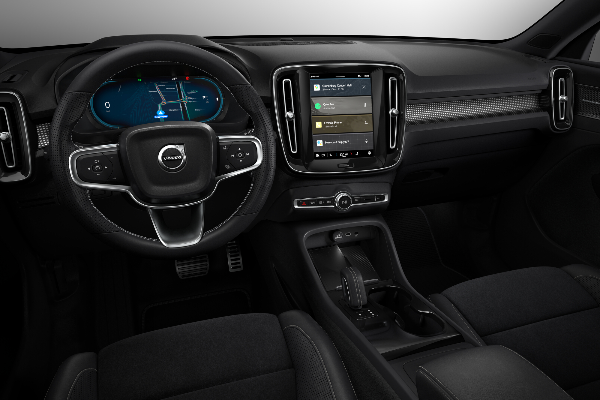 2022 年式 XC40 Recharge 車室內裝配備黑頂篷、鋁合金防滑油門/煞車踏板,車室內 Cutting Edge 霧黑鋒銳鋁合金內飾襯托全新介面12.3 吋數位整合資訊儀錶組,依車主需求顯示完整 Google map ,輔以 Google 語音助理聲控所需功能,避免分散行車注意力。XC40 Recharge 同樣配有 Google 車載資訊娛樂系統, 搭配 Google 電力里程智慧助理,依據個人駕駛習慣與使用狀況,即時預測可行駛里程或到達目的地剩餘電量,甚至能適時提醒充電並搜尋最近的充電樁。