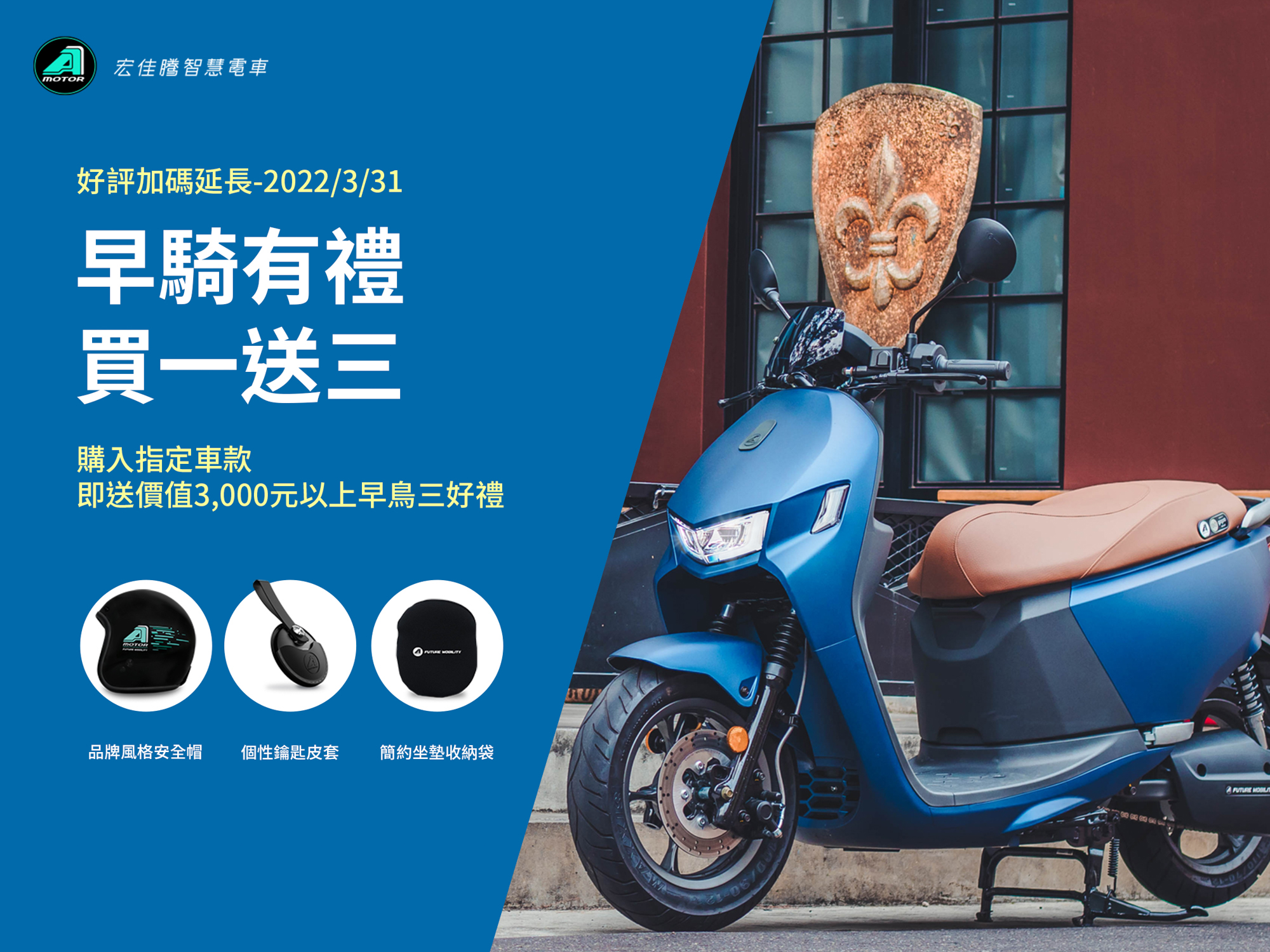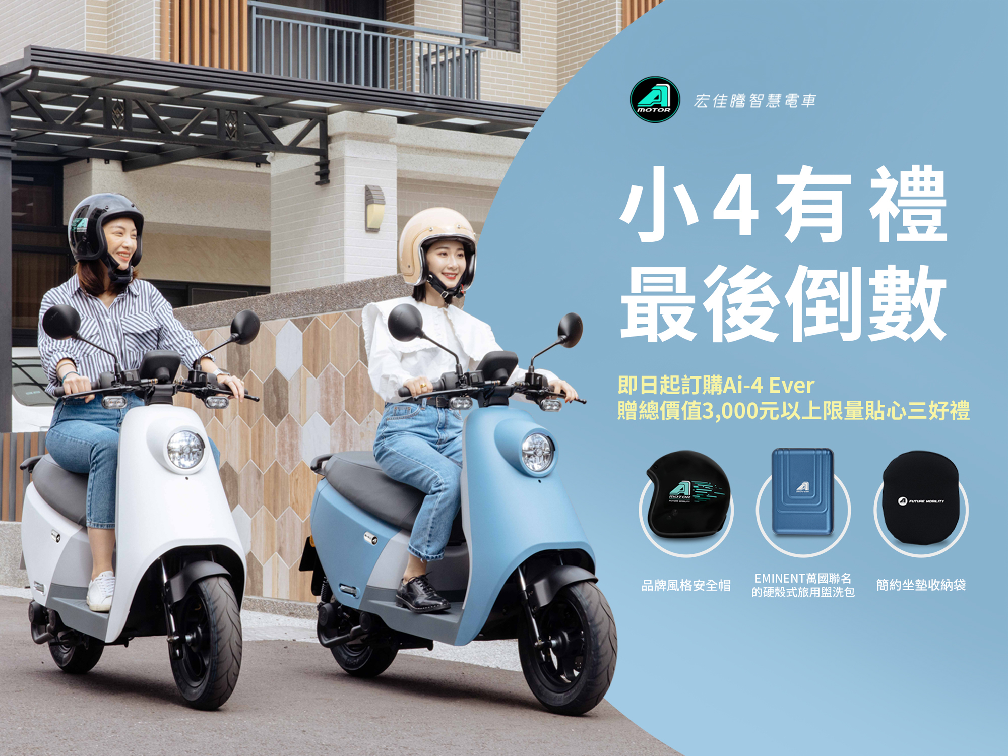 歡慶 Ai-4 Ever 正式上路,宏佳騰加碼祭出多款購車優惠與最暖心的服務回饋消費者。除了將廣受好評的「早騎有禮 買一送三」展延至 3 月 31 日;外送夥伴 3 月底前出示相關證明文件購買 Ai-1 或 Ai-3 系列車款,還可享有早鳥三好禮或總價值 3,370 元的「多功能Y型架」「極簡風飾桿」與「風格止滑腳踏墊」全新專屬購車禮(含安裝費)。