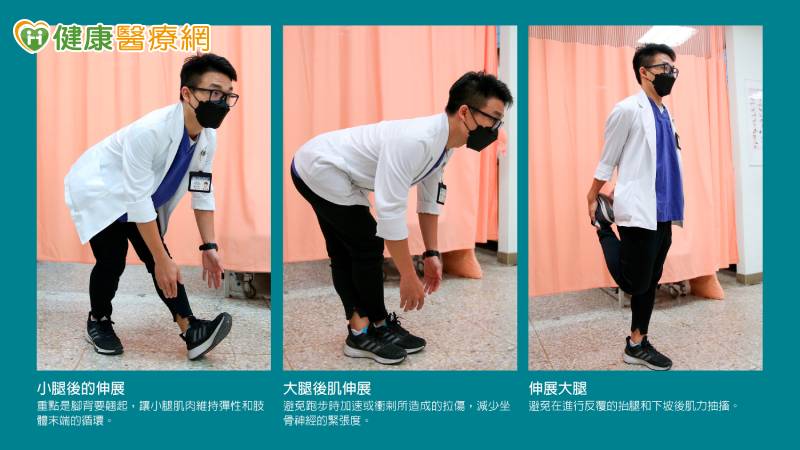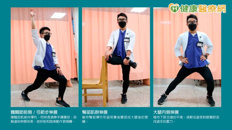 跑前熱身六招 降低運動傷害物理治療師楊子明也分享跑前熱身運動,以降低跑者的運動傷害。楊子明治療師表示,這套暖身操,在跑前建議一組做十回,每個動作維持5至10秒,在跑前30分鐘一定要有足夠的暖身時間;完賽後,也能做這套運動,每個動作維持30~60秒,來舒緩緊繃的肌肉;若是跑到一半抽筋,可針對抽筋部位,拉筋30~60秒,並建議從慢走開始,待部位較舒緩後,再加速跑起來。