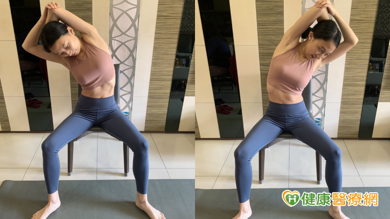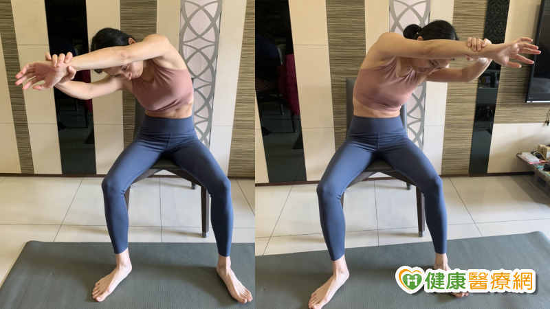 左手放鬆,右手把左手拉向右邊,腋下及側邊肋骨被伸展的感覺,同一側吐氣3下,再換邊,共做6-8回。