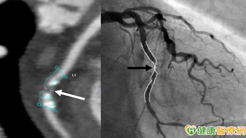 ▲一60歲男性患者,近兩個月胸痛不適、心電圖異常,做冠狀動脈電腦斷層血管攝影 (CCTA) 呈現左迴旋支動脈有鈣化和嚴重狹窄 (狹窄直徑 > 70%) (白箭號),經心導管檢查證實(黑箭號)和置放支架治療後,成功避免發生心肌梗塞
