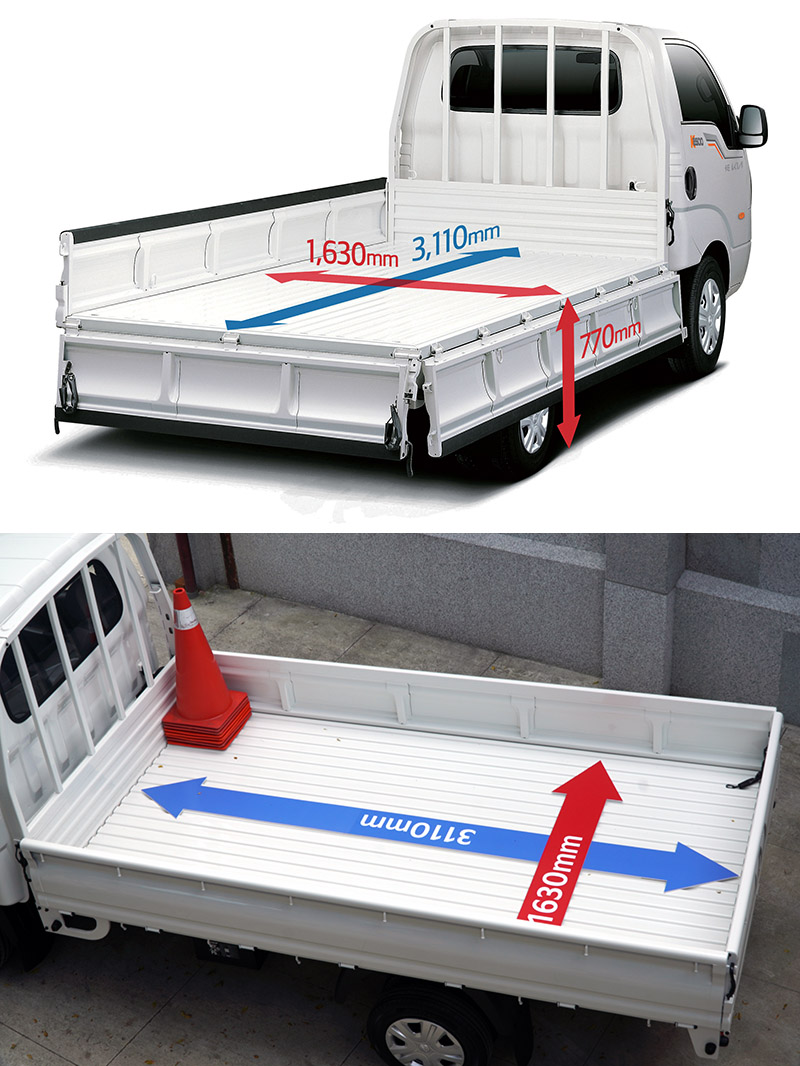 卡旺K2500並擁有同級唯一四輪傳動(註1),專屬機械式後軸差速器鎖定所帶來的強悍穿越能力。 2022年式Kia卡旺K2500,動力搭載2.5升6期環保直列4缸柴油渦輪增壓引擎,可輸出130 PS最大馬力,並擁有26 kg-m最大扭力。2022年式並提供全新5速手自排及6速手排變速箱兩種選擇,以節能且充沛的動力表現,成為頭家日常載貨的最強後援。因應台灣道路地形狹小,卡旺K2500最小迴轉半徑只有5.02m,卡旺K2500並擁有同級唯一四輪傳動(註1),專屬機械式後軸差速器鎖定所帶來的強悍穿越能力,不論上山下海都可因應地形,給予頭家全方位的支援。Kia卡旺K2500除了提供頭家駕駛最佳後盾,載貨空間更是不容小覷,貨床最大尺寸可達3,110mm長及1,630mm寬,及180度卸開貨物檔屏,讓上下搬運更加輕鬆方便;Kia卡旺K2500同時採用具備高抗壓係數的雙C大樑貨斗,最大承重可達1,489kg,相較同級擁更佳的乘載能力。