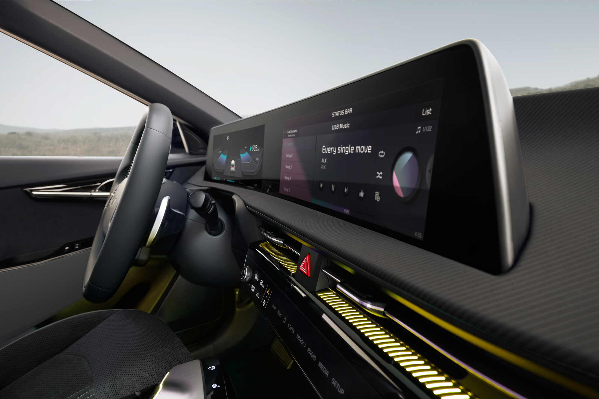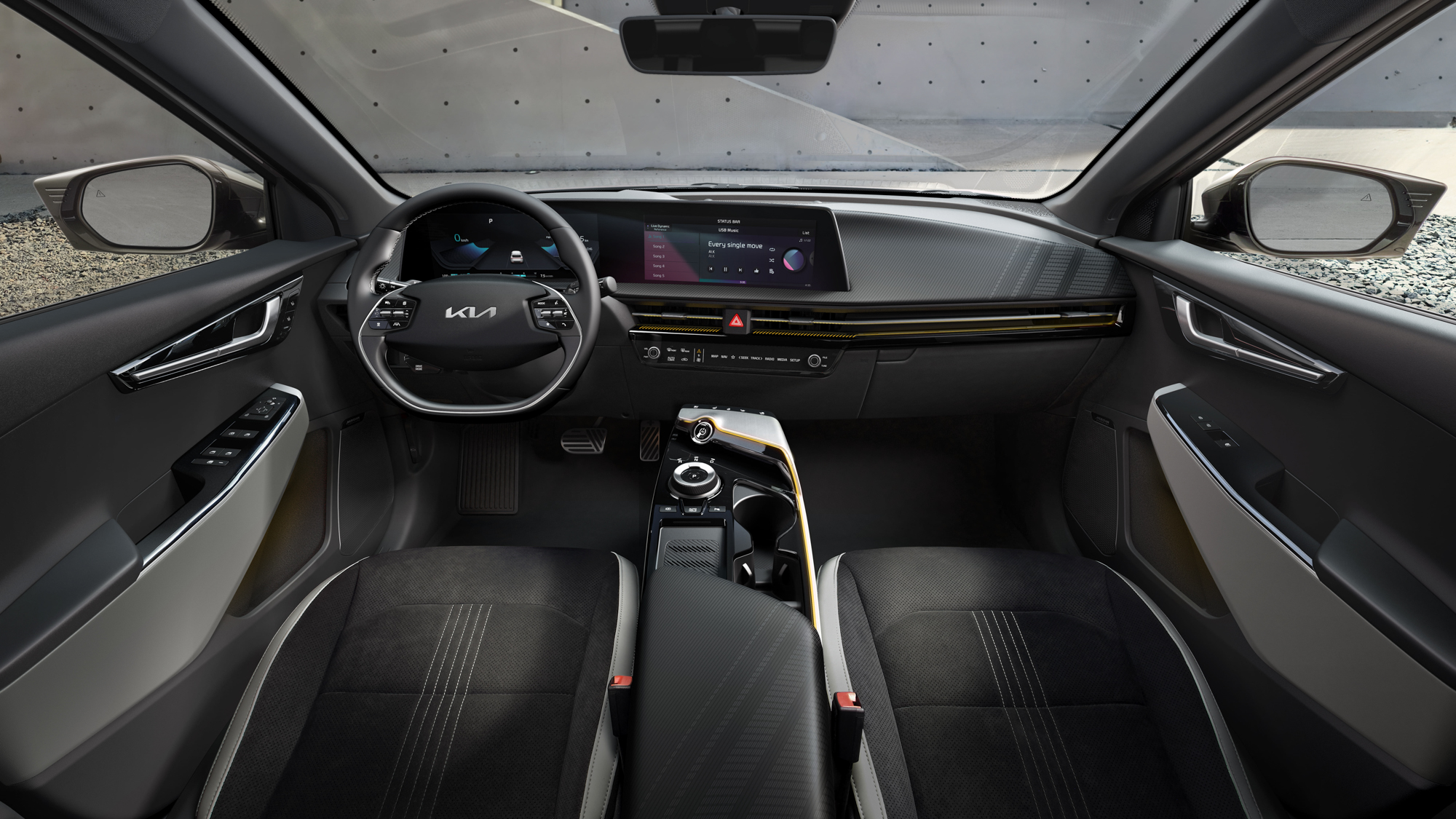 EV6 擁有獨到美學設計,車頭的天翔之翼數位日行燈,與雙月之刃尾燈組相呼應;EV6 內裝設計搭載雙 12.3 吋全景曲面顯示螢幕,搭配 64 色可調式氣氛燈,並搭載 14 具「英國之寶」Meridian™頂級環場音響系統。EV6 同時標配符合 SAE Level 2 自動駕駛分級的 DRIVE WiSE 智慧安全輔助系統,並擁有 RSPA 遙控智慧停車輔助系統及 IFS LED 智能前方照明系統(Matrix頭燈)等安全科技。