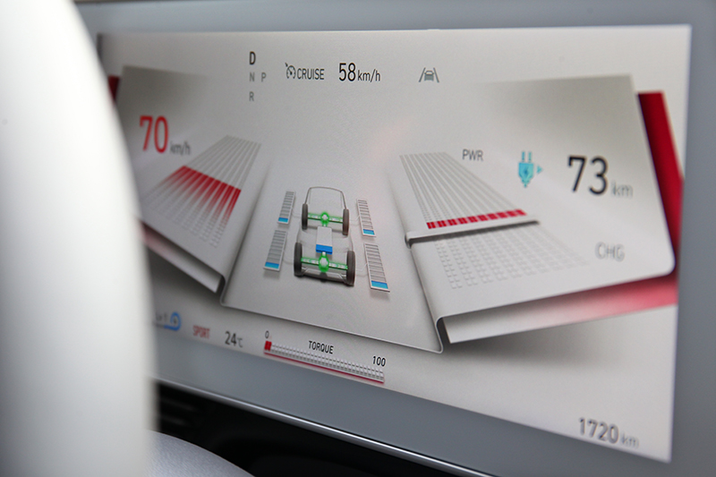 在Sport模式下重踩可是會帶來強勁的加速力道。 說到Sport模式,Ioniq 5 EV500 Performance搭載前後兩具電動馬達,為了對應高性能輸出,因此於該模式下會處於四輪驅動狀態,在此狀態下搭配電池位置帶來的低重心特性,進而在彎中大幅降低側傾,雖然整體還不至於如鋼砲般犀利,但所給予的穩定安心感,卻能讓人放心的快速劃過每個彎角。