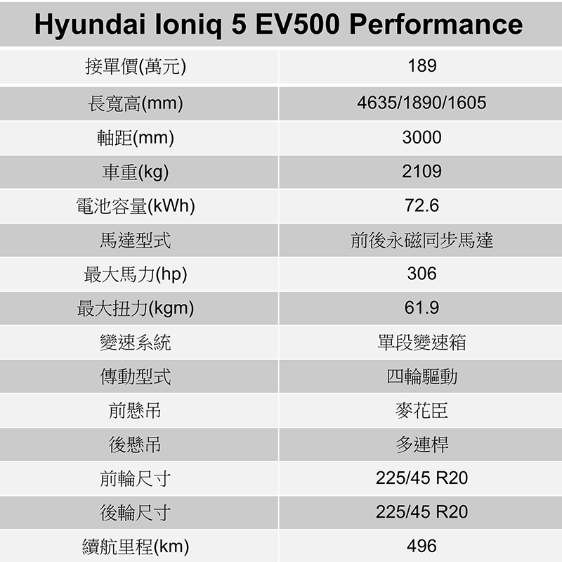 Ioniq 5 EV500 Performance擁有496公里續航里程。