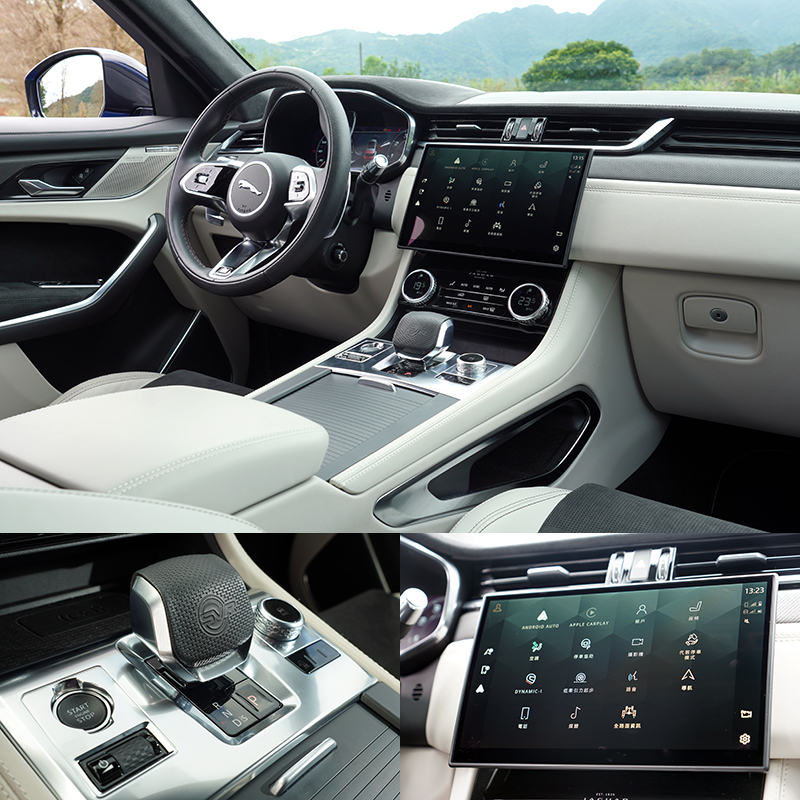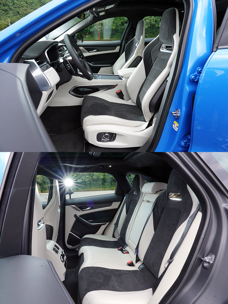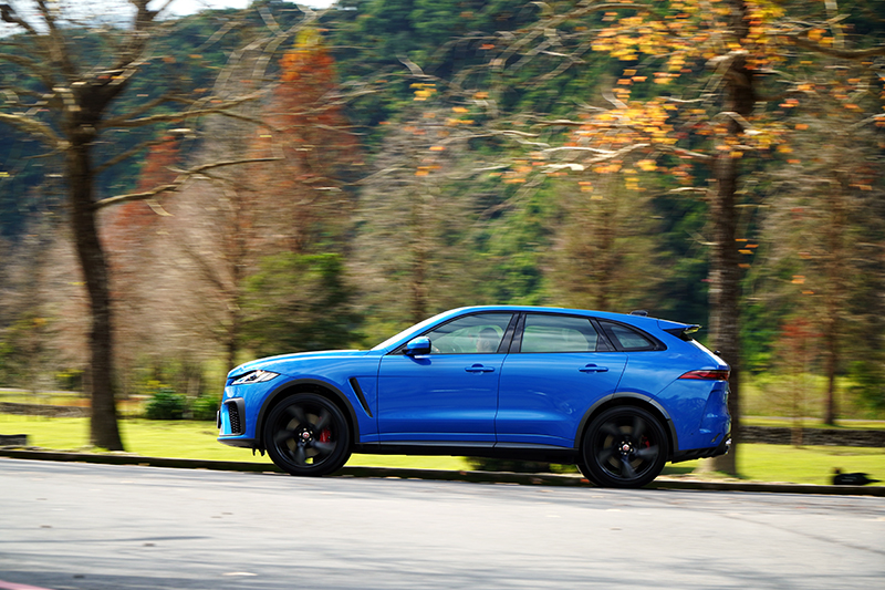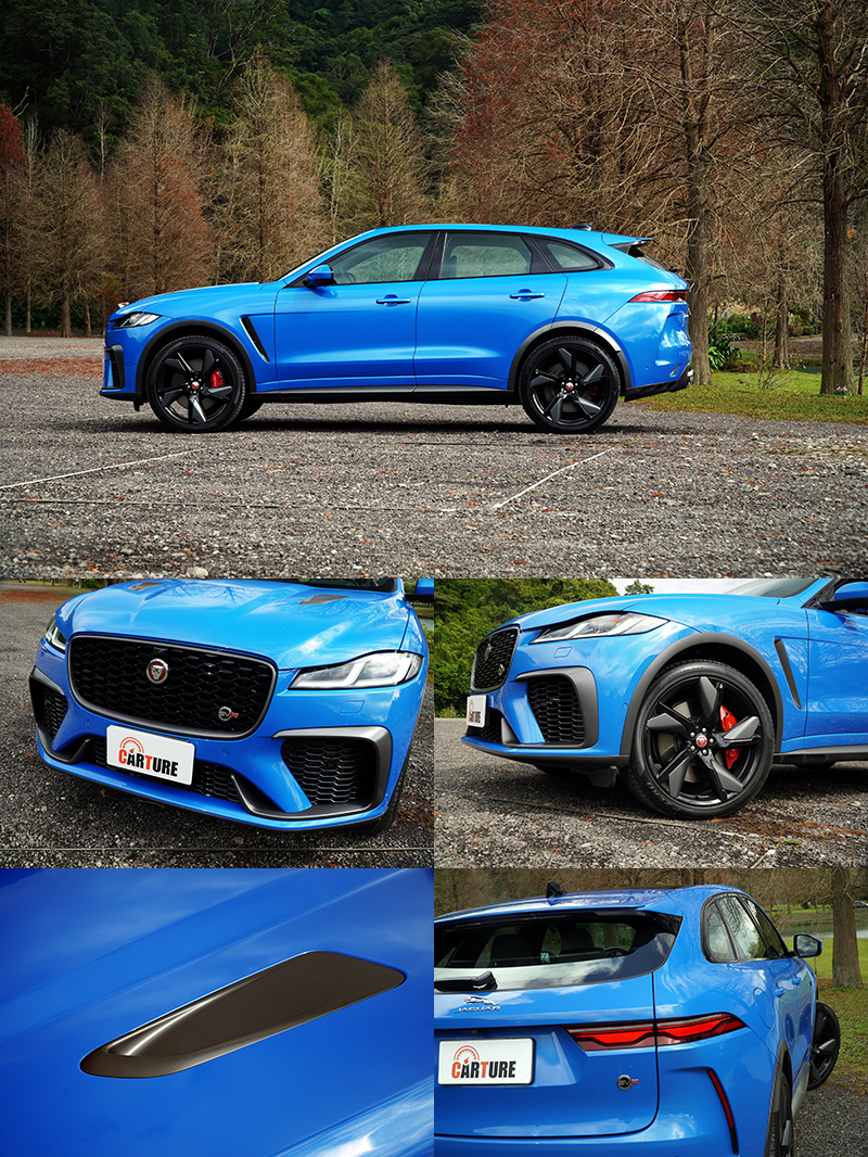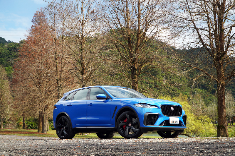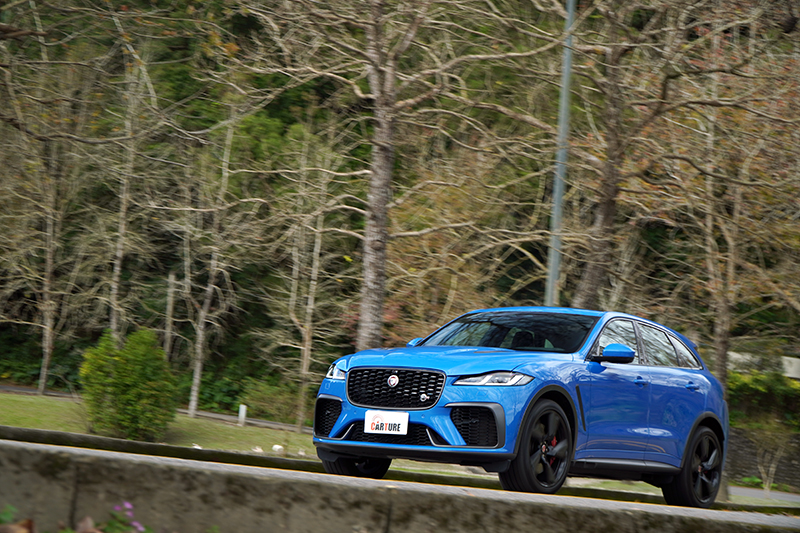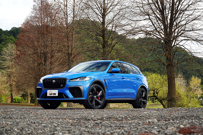 這回試駕的F-Pace SVR,基本就是跟著2021年下半年引進的小改款F-Pace後導入的,在外觀上僅有微幅更動,其中前保險桿運用刀刃式設計元素,融合嶄新的X型設計,兩側加大型煞車冷卻進氣口的格柵網狀線條,靈感源自Jaguar XE SV Project 8,透過銳利的線條形塑,另外,頭尾造型與排列也有做微幅更動,再配上,但配上專屬空力套件與21吋胎圈組後,就是呈現SVR車款該有的氣勢,試駕車更升級選配了22吋亮澤黑五輻樣式輪圈,霸氣再向上提升一級;而全車空氣力學優化更進一步減少35%的車輛抬升力,整體風阻相較改款前更減少3%。