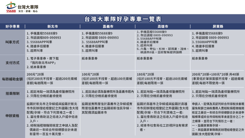 孕媽咪挺著肚子開車或騎機車實在不方便,遇到先生要上班而其他親朋好友也無法載孕媽咪做產檢時,該怎麼辦?台灣大車隊與屏東縣政府合作「好孕專車」,由屏東縣政府提供價值6,000元的孕婦產檢車資補助,正是築起孕媽咪便利性及省下交通費的福音。只要設籍在屏東的媽咪或設籍前新住民,並於屏東縣指定的19家婦產科醫療院所領取孕婦健康手冊時,同步申請屏東好孕車券,當場即可領取面額100元及200元各20張的屏東好孕車券,總價值6,000元。除本次與屏東縣政府合作之外,從101年起台灣大車隊「好孕專車」已在新北市、嘉義市、高雄市合作,目前全台共有4縣市提供此服務。
