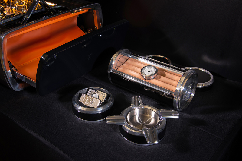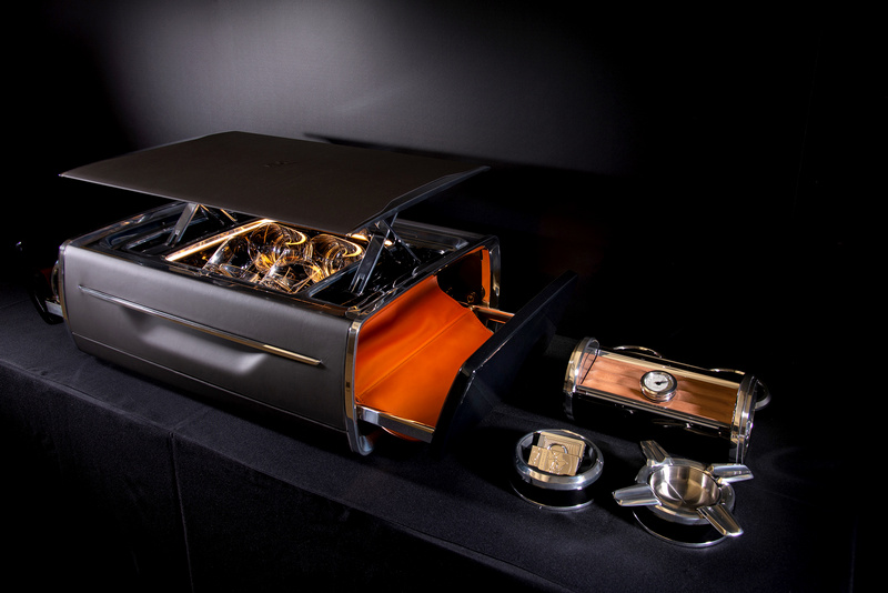 來自勞斯萊斯頂級上乘皮革編織的皮製內襯的瓶托可謂與酒杯相映成輝。該瓶托同樣以「RR」字母裝點並輔以精製鋁拴扣。瓶托旁配備有雪茄盒以供客戶使用。甄選上乘防潮木質打造的雪茄盒內置濕度計,確保雪茄在最適宜的環境下儲存,而該濕度計的設計與勞斯萊斯鐘錶指針相呼應,獨出心裁。