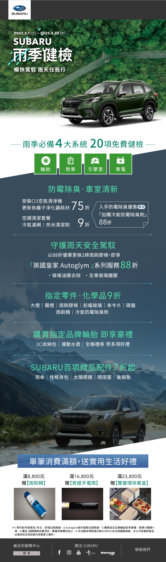 「SUBARU雨季健檢」活動自3月1日起至4月30日止,凡預約回廠將提供包含輪胎、煞車、引擎室、車電等四大系統共20項免費健檢,並可享車艙防霉除臭及原廠零配件優惠回饋,單筆消費滿額再享市值8,800元起的實用生活好禮。