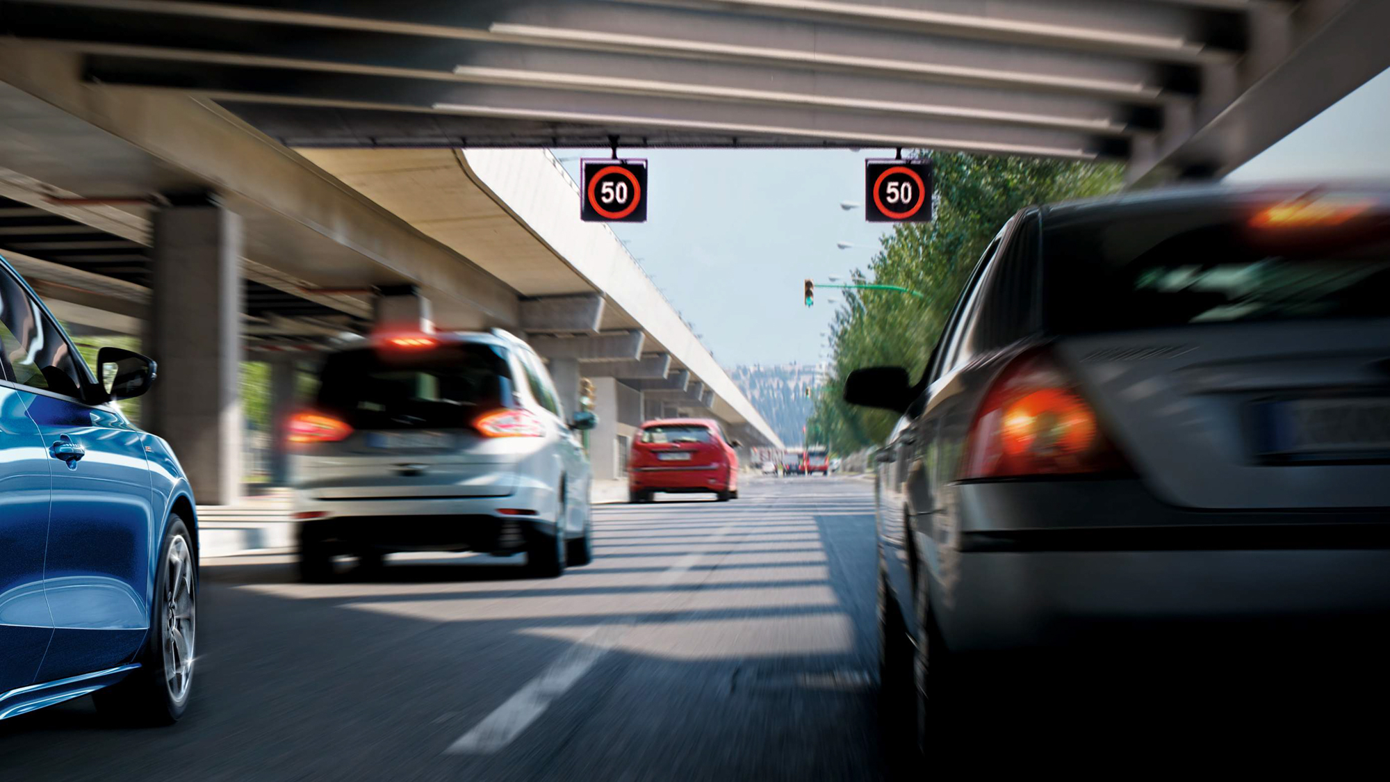倘若行駛至區間測速路段時,駕駛可透過 Ford Co-Pilot360™全方位智駕科技輔助系統的 iACC 智慧型定速巡航調節系統搭配 0-200km/h 內可作動的 ACC Stop & Go 全速域定速巡航調節系統(附低速跟車)、LCA 車道導正輔助系統、TSR 道路標誌識別輔助系統與導航圖資共同輔助於速限內前進,iACC 智慧型定速巡航調節系統能在系統辨識路標速限前提下,自動協助駕駛調節定速至行駛中路段之速限,如遇前車放緩車速,系統將同步放緩車速並維持車距;若前車駛離前方車道時,系統則自動恢復到該路段速限(結合駕駛設定之容差值速域);當前車靜止並於 3 秒內起步時,系統則會自動跟隨前車繼續前行;超過 3 秒,駕駛只需按下方向盤 Resume 鍵或踩踏油門,即可回復此系統的運作。透過 iACC 智慧型定速巡航調節系統輕鬆行駛於安全速度內,避免超速疑慮。