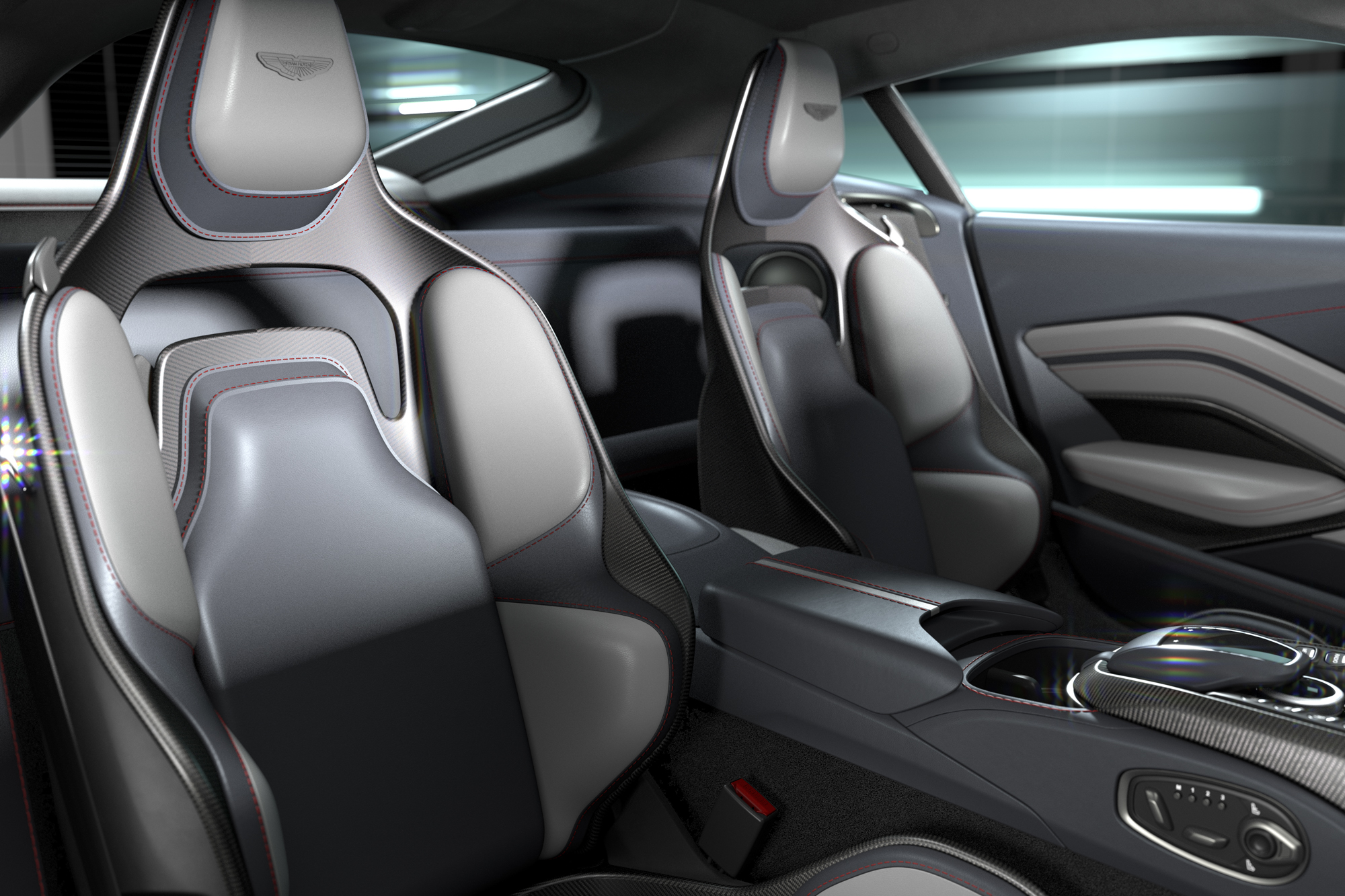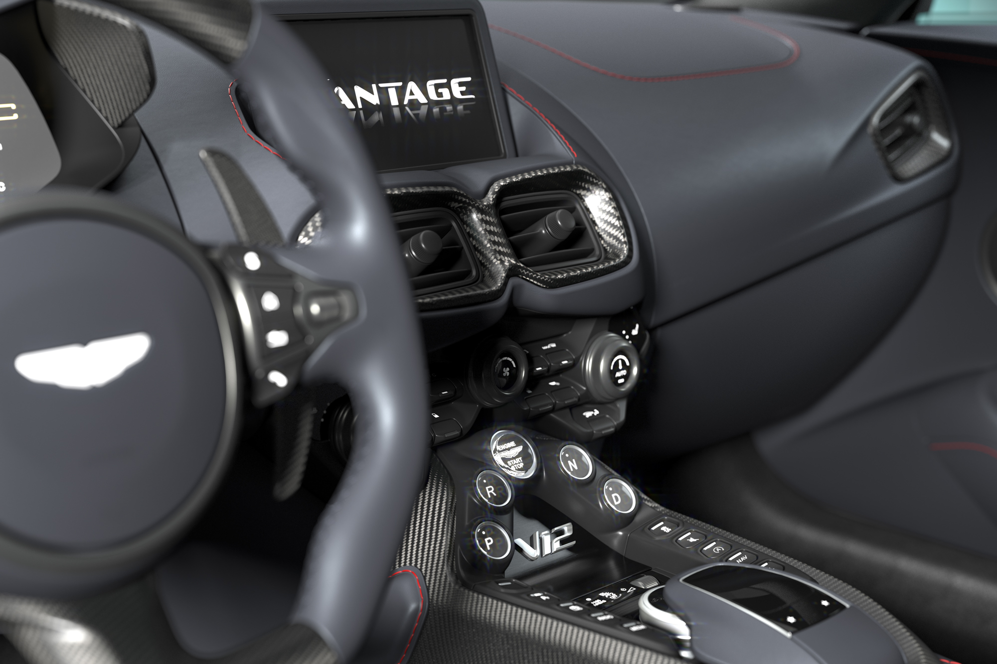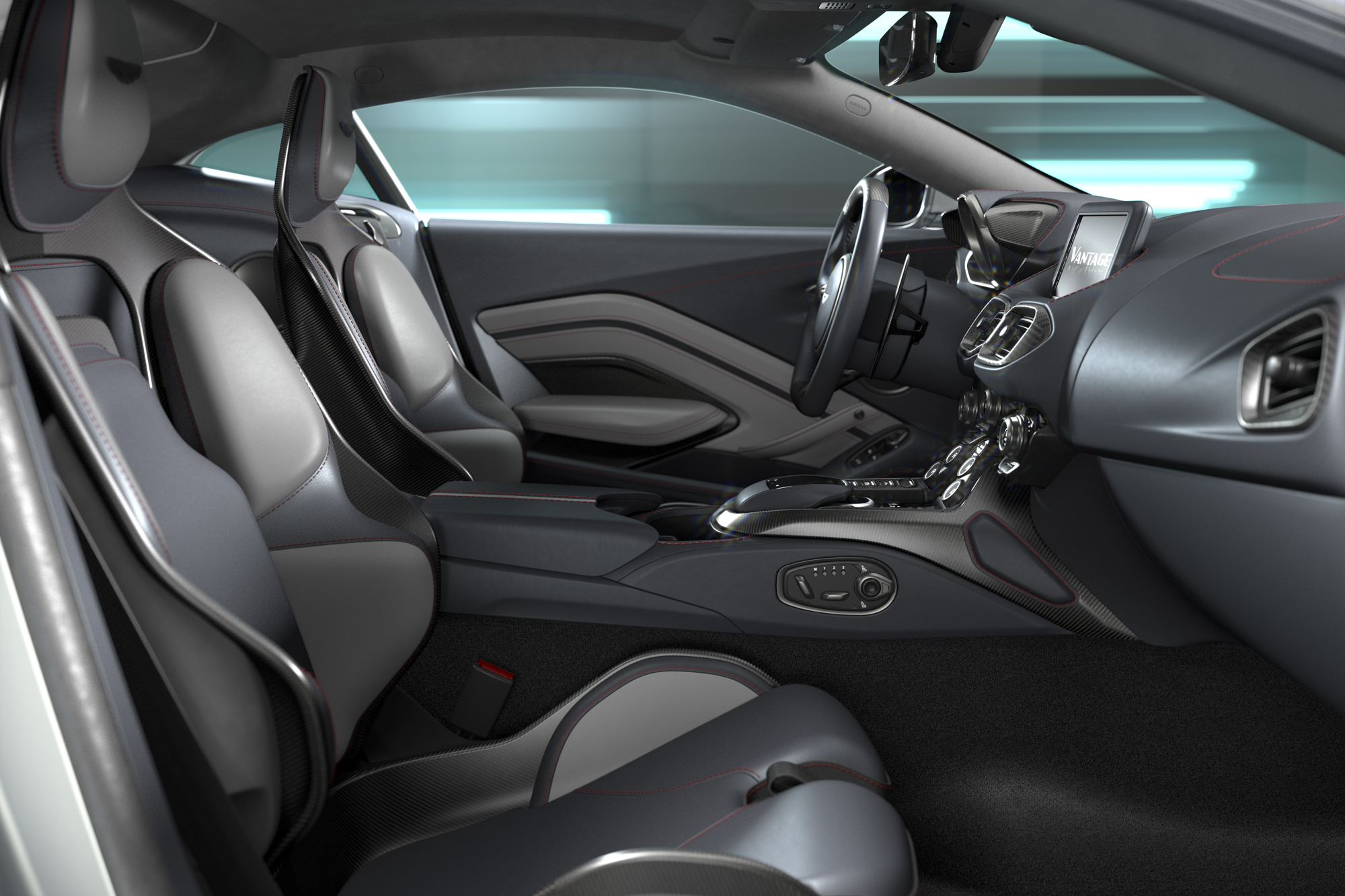 內裝方面,V12 Vantage 保留 Vantage 車款的經典樣貌標配頂級真皮的 Sports Plus 座椅,並鑲有品牌飛翼徽飾與網孔造型。車主亦可選配全新碳纖維高性能跑車座椅,配備六向調節功能,提供更佳的座椅支撐性。此款跑車座椅可在不影響乘坐舒適性的前提下,減輕 7.3 公斤座椅重量。