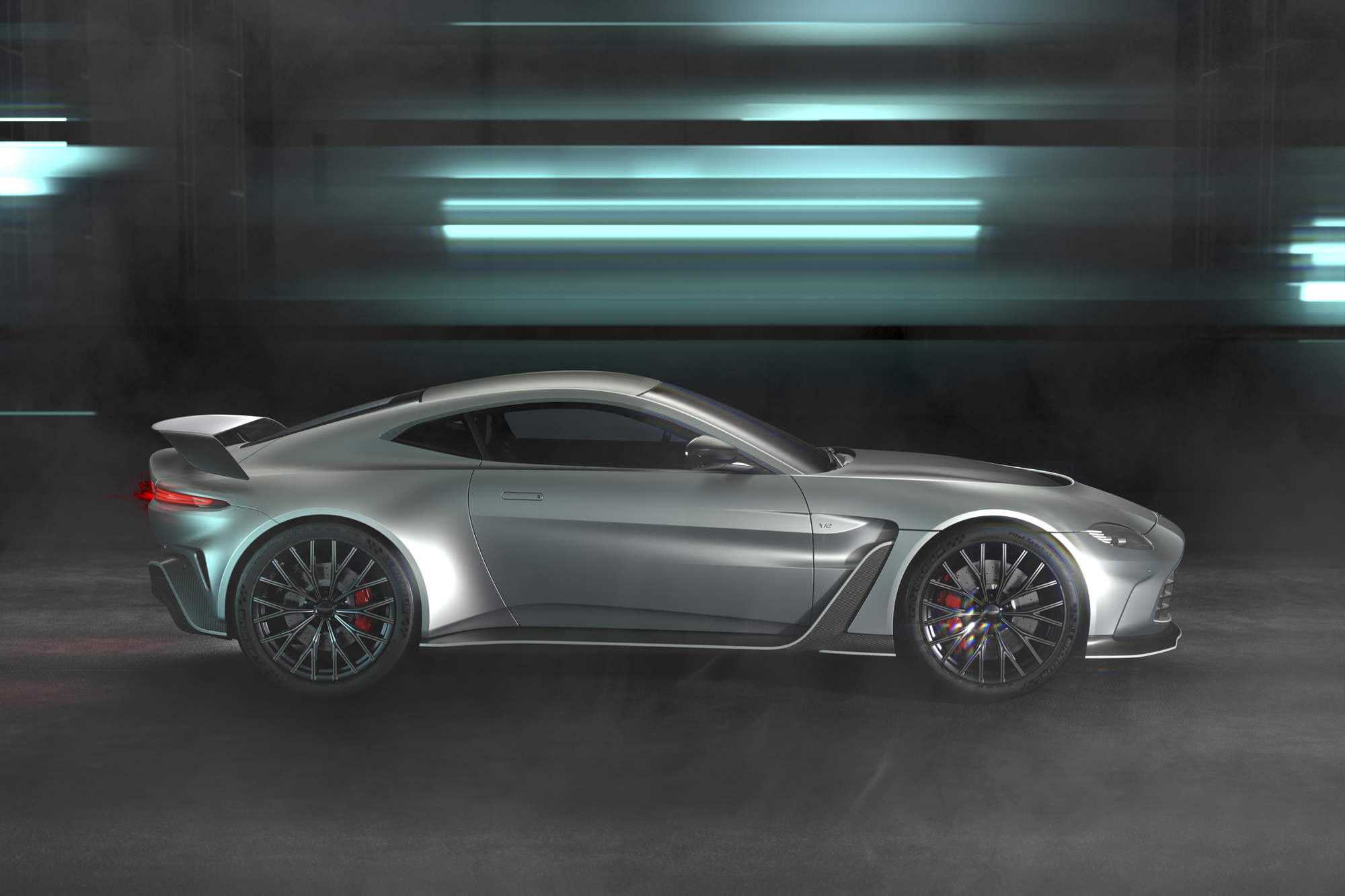 V12 Vantage 包含兩款全新 21 吋輪圈— 消光黑色Y字型輪圈與消光黑色Y字型拋光輪圈可供選擇,同時亦可加價選配重量減輕8公斤的21吋消光黑色輕量化輪圈,輪胎的配置則是採用前輪 275/35 R21和後輪 315/30 R21的Michelin Pilot 4S 高性能輪胎。