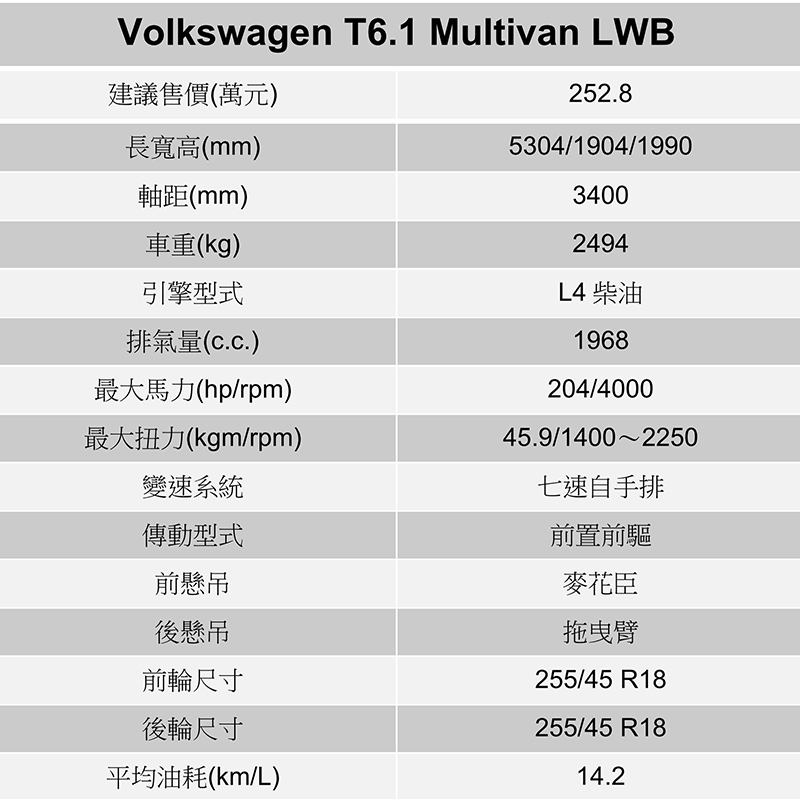 八人滿座時仍具有一定置物空間。 Multivan LWB不僅提供更寬敞舒適的乘坐體驗,配備方面也給予高水準演出,諸如雙電動側滑門、電動尾門、隱密式隔熱玻璃等都和Highline甚至Highline 4Motion相同。不僅如此於便利安全部分也有10.25吋數位儀表、具有手勢功能的9.2吋中控螢幕、導航系統、Apple CarPlay/Android Auto、ACC主動式車距調節巡航、車道維持及偏移警示、車前碰撞預警、車側盲點警示、後方橫向車流警示(含煞車輔助)、自動停車輔助等多項配備都有提供,與中高規車型相比也僅少副駕電動調整座椅、多功能會議桌、DCC動態懸吊控制與四輪驅動等。