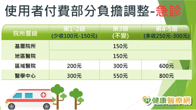為了保障急重症患者權益、也避免輕症急診就醫,急診費用則根據病患嚴重程度調整,較嚴重的第1、2級,前往區域醫院或醫學中心急診的費用減少100-150元,也就是200、300元,第3級收費不變,而相對輕微的第4、5級,若去區域醫院或醫學中心急診需再多收250-300元,也就是600、800元,改善急診醫療品質。(如圖1-圖3)