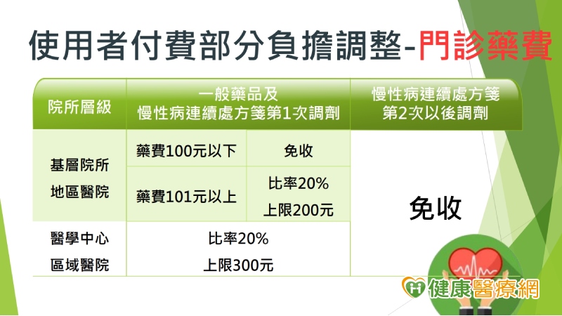 【健康醫療網/記者楊艾庭報導】衛福部於3/16日提出預告草案「全民健康保險保險對象門診藥品、門診檢驗檢查、急診應自行負擔之費用」,民眾急診、檢驗檢查、藥品等部分負擔都會增加,預估可增加107億元健保收入,減少健保點數378億支出,希冀藉由提高民眾小額負擔,相當程度地減少浪費,使醫療資源獲得更有效率的使用,調整部分負擔,強化費用意識,達到「健保永續」。