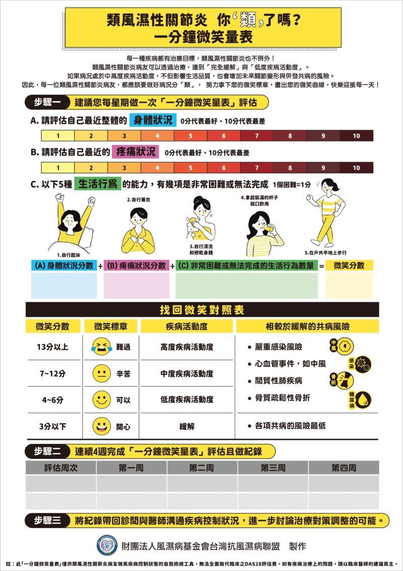 對此,財團法人風濕病基金會台灣抗風濕病聯盟推出「一分鐘微笑量表」,病友可於生活起居等各項活動中,簡單快速自評身體狀況、疼痛分數,,進而找出相對應的表情符號,幫助病友更瞭解疾病控制狀況,增加醫病間的有效溝通且幫助醫師更精準用藥。
