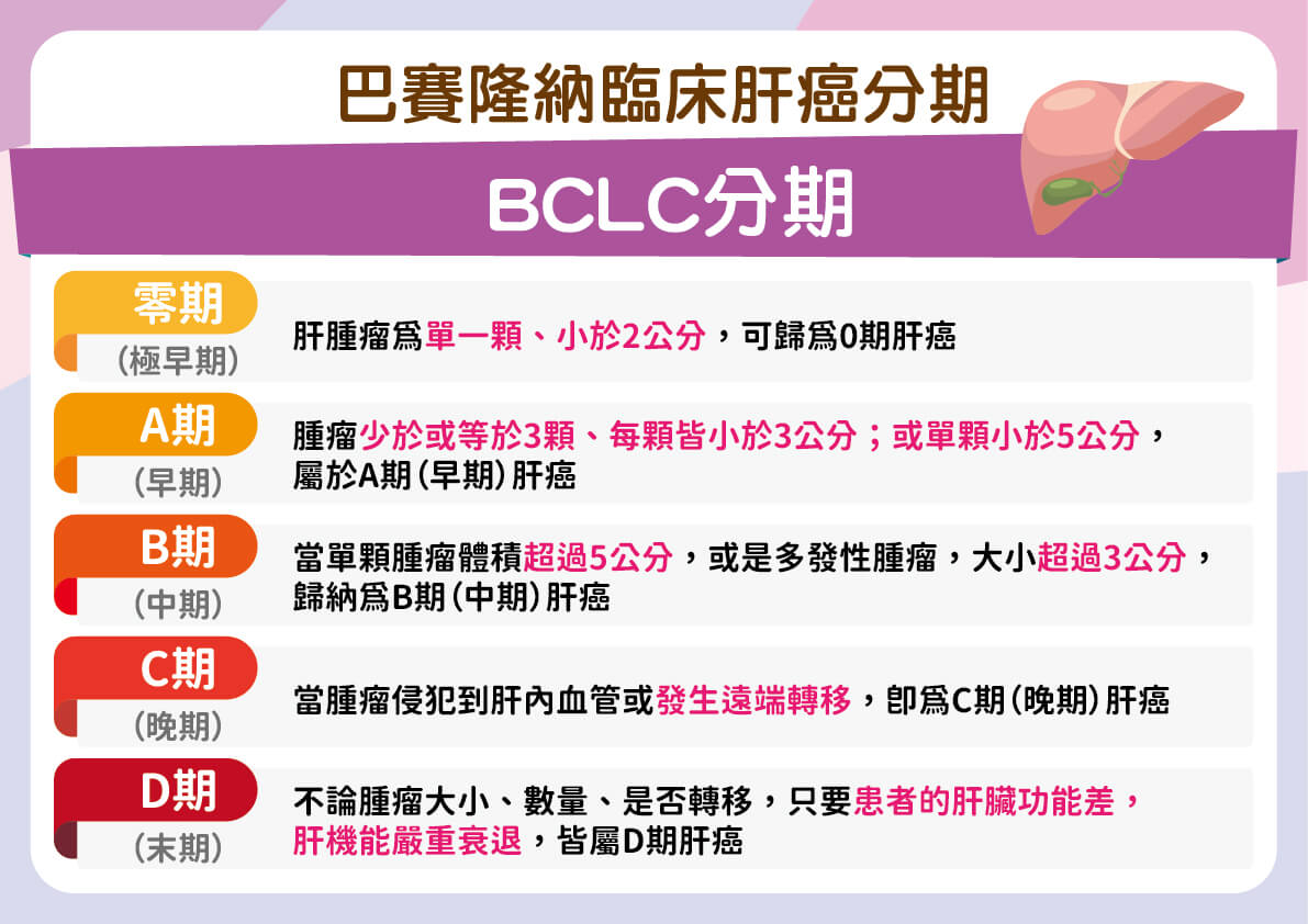 巴賽隆納分期主要可分為五期,在零期或早期時,治療目標是希望可以進行切除、換肝手術,或是RFA(射頻灼燒)等治療。第三期(中期)指的是肝腫瘤數目過多,無法用手術或是射頻等方式治療;而且,一旦肝功能開始下降,無法應付身體所需,產生失代償性肝功能時,可能已是第四期、第五期。