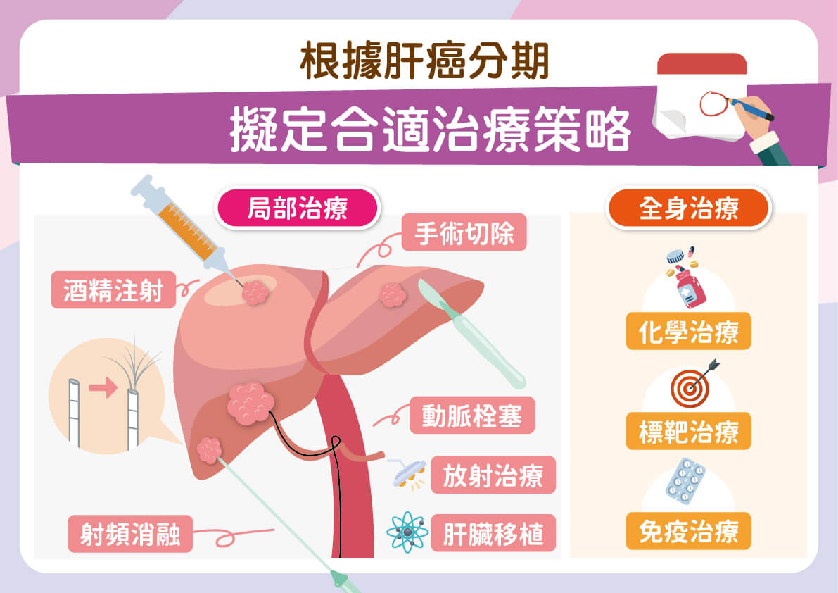 除了針對腫瘤的局部治療外,醫師還會根據肝癌病友的個人病況,搭配使用全身性治療(包括化學治療、標靶治療、免疫治療等)。林俊彥主任表示,從第三期(中期)到第四期,已出現肝外或靜脈等轉移,無法使用栓塞治療,就需要系統性治療的幫助。像是中期癌友,現在健保有給付栓塞治療,若治療三次失敗才有機會進行全身性治療。