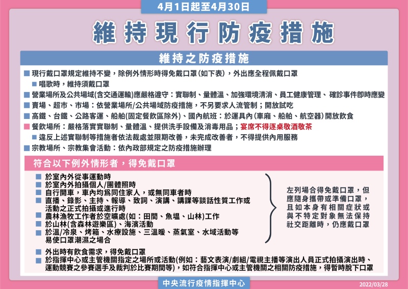 【健康醫療網/記者楊艾庭報導】由於國內疫情多點爆發,中央流行疫情指揮中心於今日(28)記者會公布,考量國內疫情嚴峻,4/1-4/30強化特定娛樂場所防疫作為,並維持現行口罩等防疫措施。