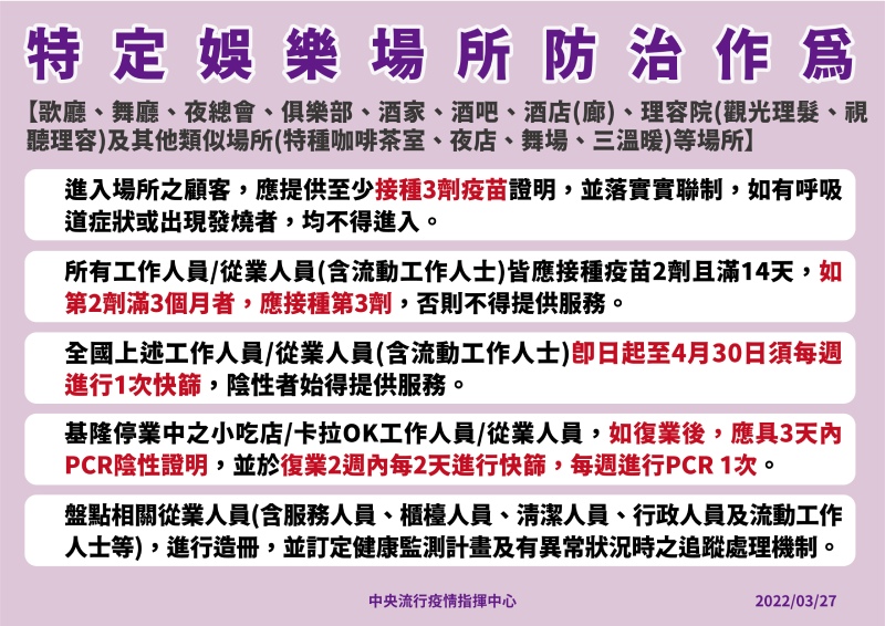 4.基隆停業中之小吃店、卡拉OK工作人員,如復業後,應具3天內PCR陰性證明,並於復業2週內每2天進行快篩,每週進行PCR 1次。