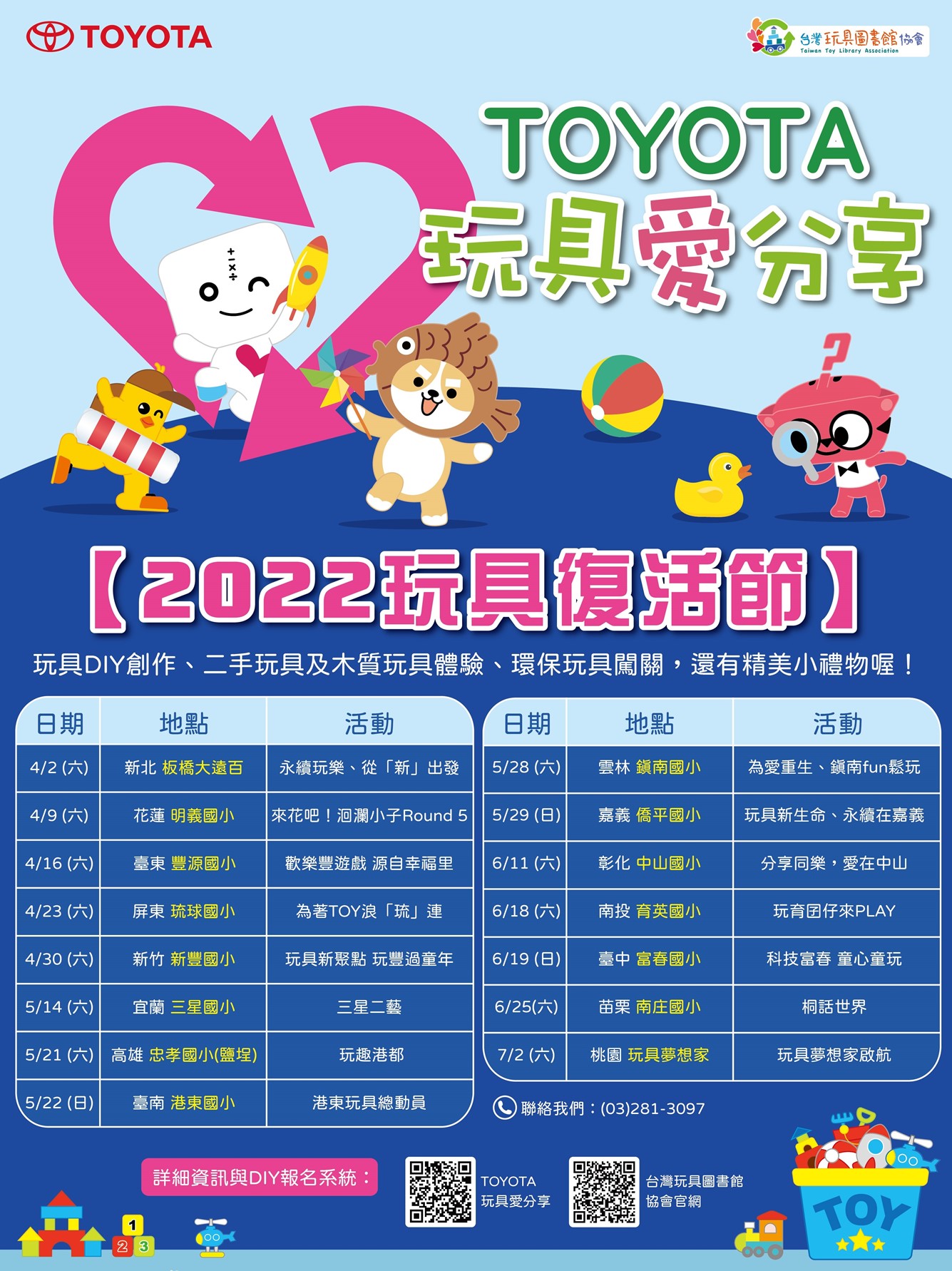 Toyota 自 2016 年起與台灣圖書館玩具協會共同舉辦「玩具愛分享」活動,回收玩具為環保盡一份心力,玩具再生為更多需要的人帶來歡樂。2022 年玩具愛分享活動將持續舉辦,活動包含:玩具回收、玩具復活節、小小技師體驗營、傳愛背包、玩具巡迴車,多項豐富活動,活動不限 Toyota 車主參加,歡迎所有民眾共同參與。