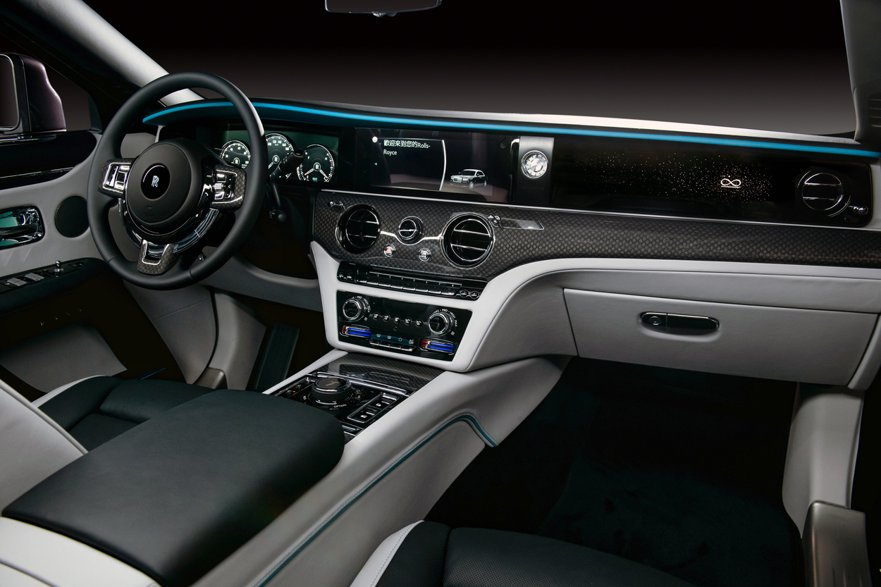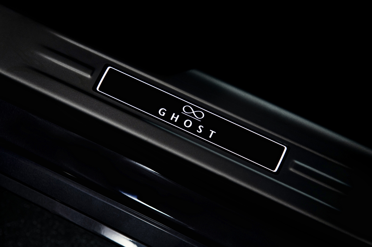 鐘錶兩側為全新 Ghost 獨有的創新設計—星光飾板,採用 850 顆點點繁星環繞著散發幽幽光芒的無限標識,星光飾板位於副駕駛一側,下方安裝 152 支 LED 燈源可點亮星光飾板,內飾燈光關閉時星空與標識完全隱形。其色調與車內鐘錶和儀錶照明和諧一致,而為保證標識光源均勻,LED 燈源採用厚度為 2 公釐的光導,表面配有逾 9 萬個鐳射蝕刻點,不僅保證標識被均勻點亮,更模擬星空閃爍效果,視線所及點點繁星,與星光頂篷遙相呼應。
