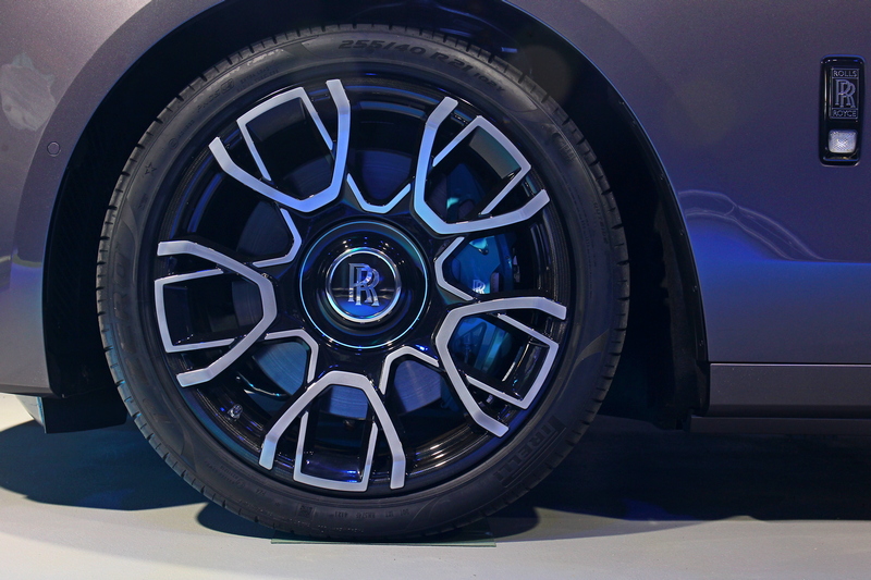 勞斯萊斯Black Badge Ghost的外觀設計還包括Bespoke高級定制的21吋複合輪框。該輪框延續了Black Badge風格,並打造了Black Badge Ghost專屬設計,每個輪輻均由位於三軸之上的22片碳纖維組成,每片碳纖維在輪輻外邊緣向後折,共形成44片碳纖維,以提升強度。為凸顯材料卓越品質與非凡的表面效果,車輪採用淺色漆噴塗以保護飾面,與此同時,仍然可觀察到這款車框先進獨特的碳纖維結構。